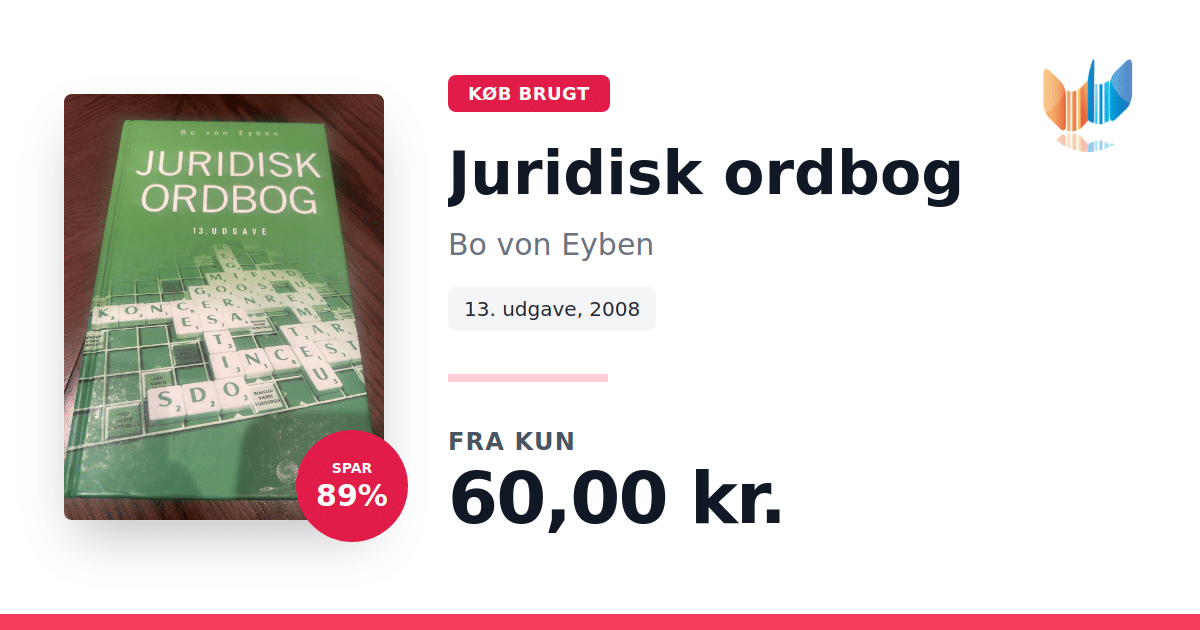 Lige nu kan du købe "Juridisk ordbog" af Bo von Eyben til kun 60,00 kr. Du sparer hele 89% af nyprisen! Bogen du ser her er brugt, og i perfekt stand. Vi har i øjeblikket kun et enkelt eksemplar til salg af "Juridisk ordbog", så slå til mens du kan!