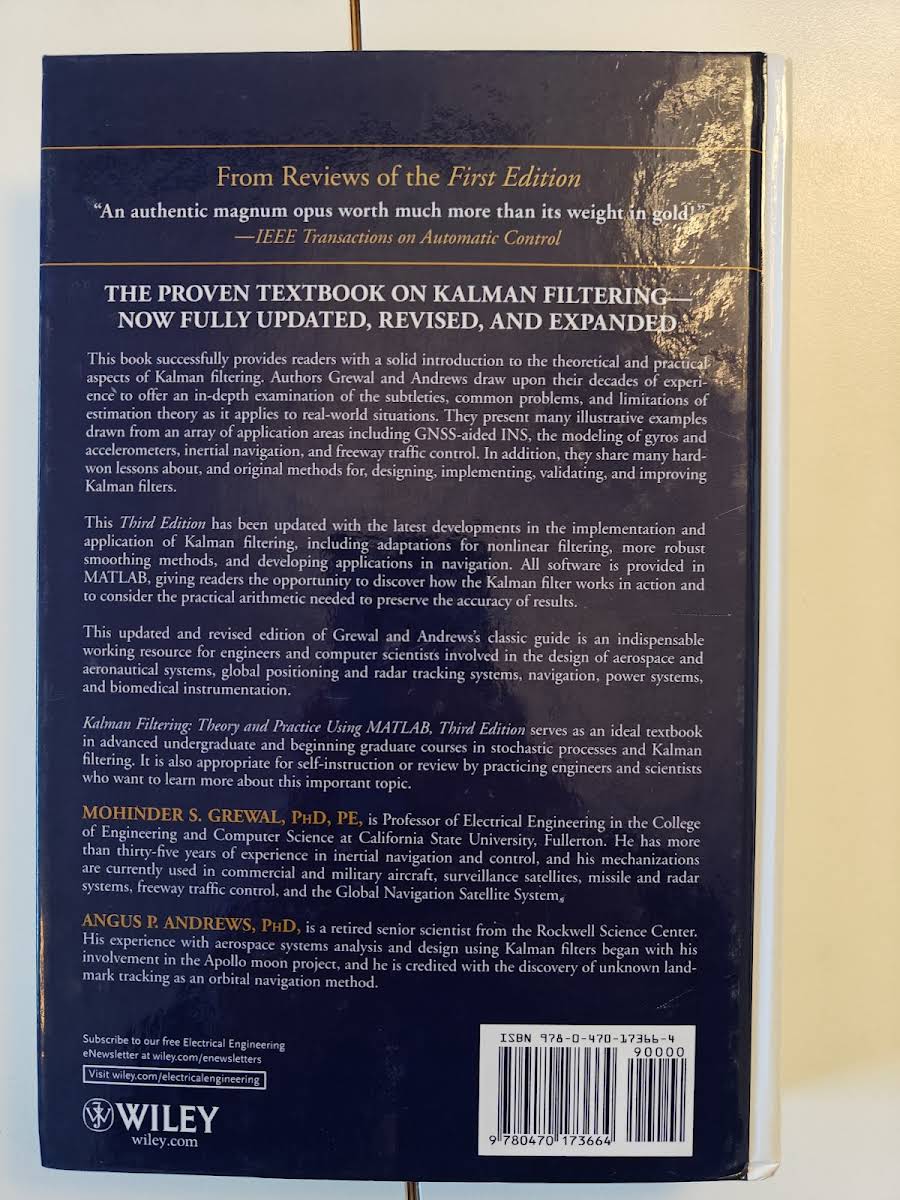 Kalman Filtering: Theory and Practice Using MATLAB af Mohinder S. Grewal og Angus P. Andrews giver en grundig introduktion til både de teoretiske principper og de praktiske anvendelser af Kalmanfiltre. Bogen henvender sig til ingeniører, forskere og studerende, der ønsker en dybdegående forståelse af filterets matematiske fundament og dets rolle i moderne signalbehandling. I denne udgave er indholdet opdateret med de seneste fremskridt inden for implementering og anvendelse af Kalmanfiltre. Der lægges særlig vægt på tilpasninger til ikke-lineær filtrering, udviklingen af mere robuste smoothing-metoder samt nye anvendelser inden for navigationssystemer og positionsbestemmelse. Alle eksempler og øvelser understøttes af fuld MATLAB-kode, så læseren kan afprøve og eksperimentere direkte med algoritmerne. De praktiske gennemgange sikrer, at man opnår indsigt i de nødvendige beregningsmetoder for at bevare nøjagtigheden i de endelige resultater.