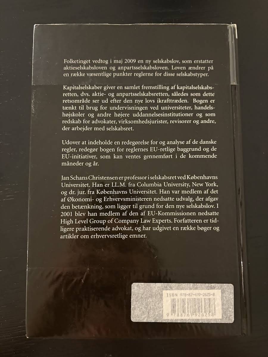 Kapitalselskaber – Aktie- og anpartsselskabsret byder på en samlet og opdateret fremstilling af de væsentlige ændringer i dansk selskabsret, som trådte i kraft med den nye selskabslov i maj 2009. Bogen gennemgår de reformer, der erstatter de tidligere love om aktie- og anpartsselskaber, og redegør for ændringerne inden for stiftelse, selskabskapital, aktier, anparter samt selvfinansiering og ledelsesstrukturer. Bogen henvender sig til studerende på universiteter, handelshøjskoler og andre højere uddannelsesinstitutioner samt til jurister, virksomhedsjurister, revisorer og andre praktiserende inden for selskabsret. Den giver et præcist indblik i de danske regler og udfolder samtidig de EU-retlige overvejelser og initiativer, der kan forventes at få betydning i de kommende år. Forfatter Jan Schans Christensen kombinerer sin dybdegående akademiske viden med praktisk erfaring fra sit virke som advokat. Hans ekspertise og indsigt sikrer, at bogen udgør et solidt redskab for alle, der ønsker at forstå de nye tendenser og retsregler, der præger kapitalselskabsretten i dag.