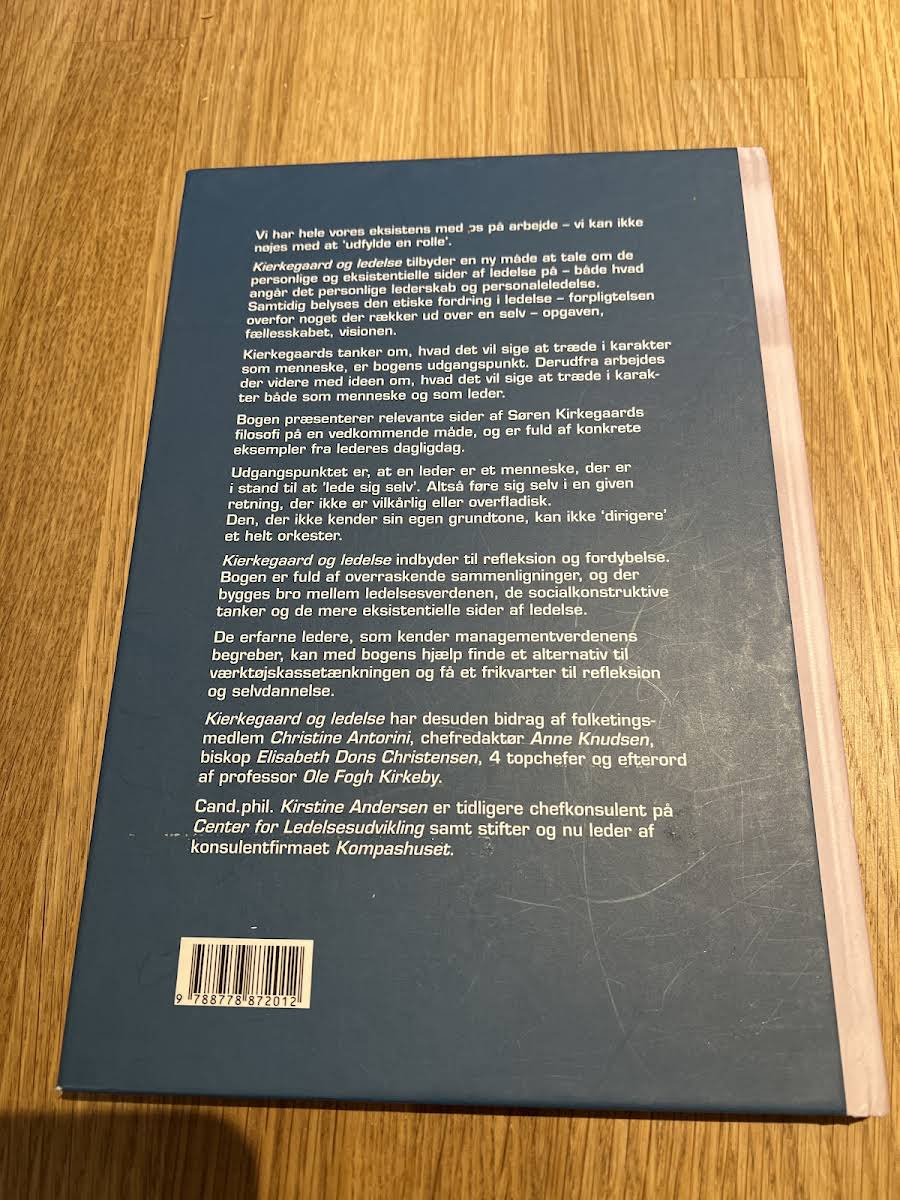 Kierkegård og ledelse præsenterer en original tilgang til ledelse, hvor Søren Kierkegaards tanker om at træde i karakter danner udgangspunkt for forståelsen af stærkt lederskab. Bogen understreger betydningen af etisk forpligtelse – en forpligtelse der omfatter både den personlige udvikling og ansvaret for fællesskabet, opgaven og visionen. Med en kombination af teoretiske perspektiver og konkrete eksempler fra daglig lederpraksis, giver Kirstine Andersen læseren indsigt i, hvordan man leder sig selv, før man kan lede andre. Resultatet er en inspirerende og vedkommende udforskning af, hvad det vil sige at træde i karakter som både menneske og leder.