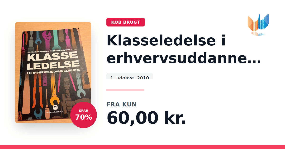 Lige nu kan du købe "Klasseledelse i erhvervsuddannelserne" til kun 60,00 kr. Du sparer hele 70% af nyprisen! Bogen du ser her er brugt, og i god stand. Vi har i øjeblikket 2 eksemplarer til salg af "Klasseledelse i erhvervsuddannelserne", så husk at se de forskellige udgaver.