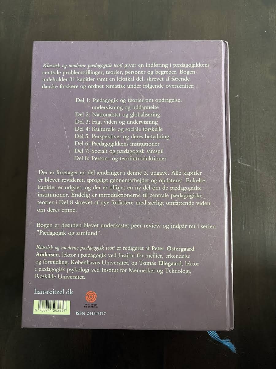"Klassisk og moderne pædagogisk teori" er en omfattende indføring i pædagogikkens centrale problemstillinger, teorier, personer og begreber. Med sine 31 kapitler og en leksikal del præsenteres læseren for et bredt spektrum af pædagogiske perspektiver, som alle er skrevet af førende danske forskere og inddelt i otte tematiske sektioner. I denne 8. udgave er indholdet omhyggeligt revideret, sprogligt strømlinet og opdateret med nye bidrag fra erfarne forfattere, der giver et fornyet indblik i både klassiske og moderne tilgange. Bogen fremhæver, hvordan pædagogikkens teoretiske fundament fortsat er relevant for forståelsen af de komplekse forhold mellem undervisning, opdragelse og samfund. " Klassisk og moderne pædagogisk teori" indgår desuden i serien "Pædagogik og samfund" og udgør et uundværligt redskab for både studerende og undervisere, der ønsker at dykke dybt ned i pædagogikkens rige teoretiske landskab.