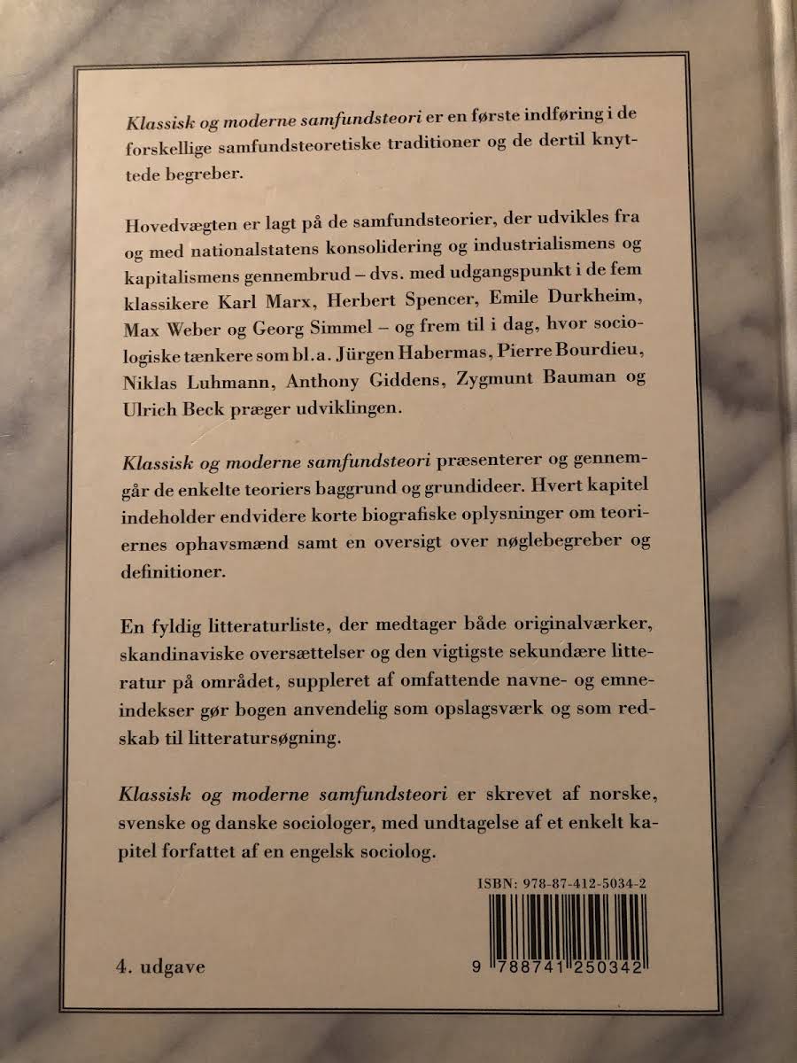 I den 4. udgave af Klassisk og moderne samfundsteori er der foretaget omfattende revisioner, der afspejler de seneste udviklinger og teoretiske strømninger inden for samfundsvidenskaben. Bogen, der rummer 808 sider, indeholder opdaterede analyser og nye perspektiver, herunder et revideret kapitel om civilsamfund, medborgerskab og social kapital, som giver læseren et aktualiseret indblik i samfundets dynamikker. Endvidere er kapitler om centrale begreber som stat, nation og national identitet blevet gennemgået i lyset af de seneste forskningsresultater, mens diskussionen om kritiske teorier og tilgangen til moderne samfundsproblemer er blevet udvidet med nødvendige tilføjelser. Med bidrag fra fremtrædende samfundsforskere som Gorm Harste, Klaus Rasborg, Anders Ramsay, Dag Østerberg og flere, fungerer denne udgave som et uundværligt redskab for både undervisning og som et opslagsværk. Den opdaterede litteratur og de nyintegrerede perspektiver sikrer, at Klassisk og moderne samfundsteori fortsat er relevant og anvendelig i flere kommende år. Udgaven er trykt af Gyldendal i 2007 og afspejler et solidt fundament, der binder klassiske teorier sammen med moderne fortolkninger.