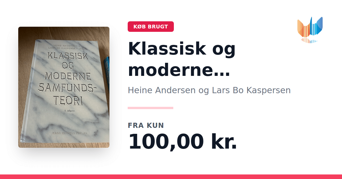 Lige nu kan du købe "Klassisk og moderne samfundsteori" af Heine Andersen og Lars Bo Kaspersen til kun 100,00 kr. Bogen du ser her er brugt, og i god stand. Vi har i øjeblikket kun et enkelt eksemplar til salg af "Klassisk og moderne samfundsteori", så slå til mens du kan!