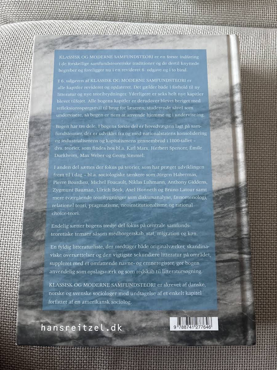 Denne sjette udgave af Klassisk og moderne samfundsteori byder på en grundigt opdateret og revideret fremstilling af de samfundsteoretiske traditioner. Bogen er blevet tilpasset den nyeste litteratur og reflekterer aktuelle teoribrydninger, supplere med seks helt nye kapitler. Hvert kapitel indeholder desuden refleksionsspørgsmål, så både studerende og undervisere nemt kan anvende materialet i henholdsvis selvstudie og undervisningssammenhænge. I den første del af bogen sættes der fokus på de samfundsteorier, som opstod i kølvandet på nationalstatens konsolidering samt industrialismens og kapitalismens gennembrud i 1800-tallet – en teoretisk arv, der blandt andet omfatter tænkere som Karl Marx, Herbert Spencer, Émile Durkheim, Max Weber og Georg Simmel. Den anden del udvider perspektivet ved at præsentere moderne teoribygninger og sociologiske tilgange. Her kommer blandt andre Jürgen Habermas, Pierre Bourdieu, Michel Foucault, Niklas Luhmann og Anthony Giddens i spil, suppleret med tværgående metoder som diskursanalyse, fænomenologi, relationel teori, pragmatisme, neoinstitutionalisme og rational choice-teori. Afslutningsvis behandler den tredje del centrale temaer som medborgerskab, stat, migration og køn. En omfattende litteraturliste og et detaljeret navne- og emneregister gør bogen til et uundværligt redskab for alle med interesse for klassiske og moderne samfundsteorier.