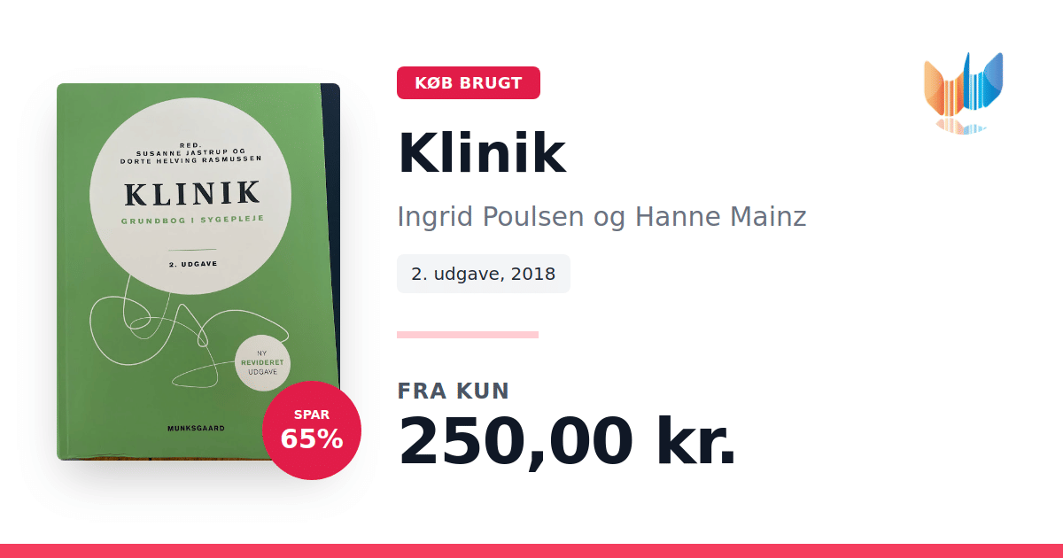 Lige nu kan du købe "Klinik" af Ingrid Poulsen og Hanne Mainz til kun 250,00 kr. Du sparer hele 65% af nyprisen! Bogen du ser her er brugt, og i perfekt stand. Vi har i øjeblikket 7 eksemplarer til salg af "Klinik", så husk at se de forskellige udgaver.