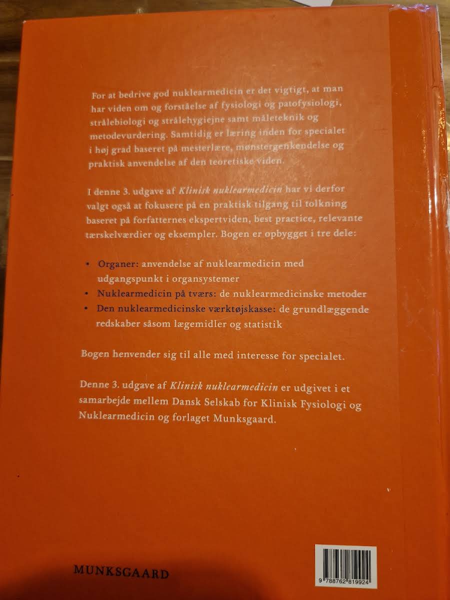 For at udøve kvalificeret nuklearmedicin er det afgørende at have indgående forståelse for fysiologi og patofysiologi, strålebiologi og strålehygiejne samt færdigheder inden for måleteknik og metodevurdering. Læring i specialet bygger desuden i høj grad på mesterlære, mønstergenkendelse og konkret anvendelse af teoretisk viden i kliniske situationer. I denne 3. udgave af Klinisk nuklearmedicin (2022) lægges der særlig vægt på en praktisk tilgang til billed- og datatolkning, understøttet af forfatternes ekspertviden, best practice, relevante tærskelværdier og illustrative eksempler. Bogen er inddelt i tre hoveddele: 1. Organer - nuklearmedicinske metoder på tværs af organsystemer 2. Nuklearmedicin på tværs - teknikker og modaliteter 3. Den nuklearmedicinske værktøjskasse - grundlæggende redskaber som lægemidler og statistik Klinisk nuklearmedicin retter sig mod alle med interesse for specialet og er udgivet i samarbejde mellem Dansk Selskab for Klinisk Fysiologi og Nuklearmedicin og forlaget Munksgaard.