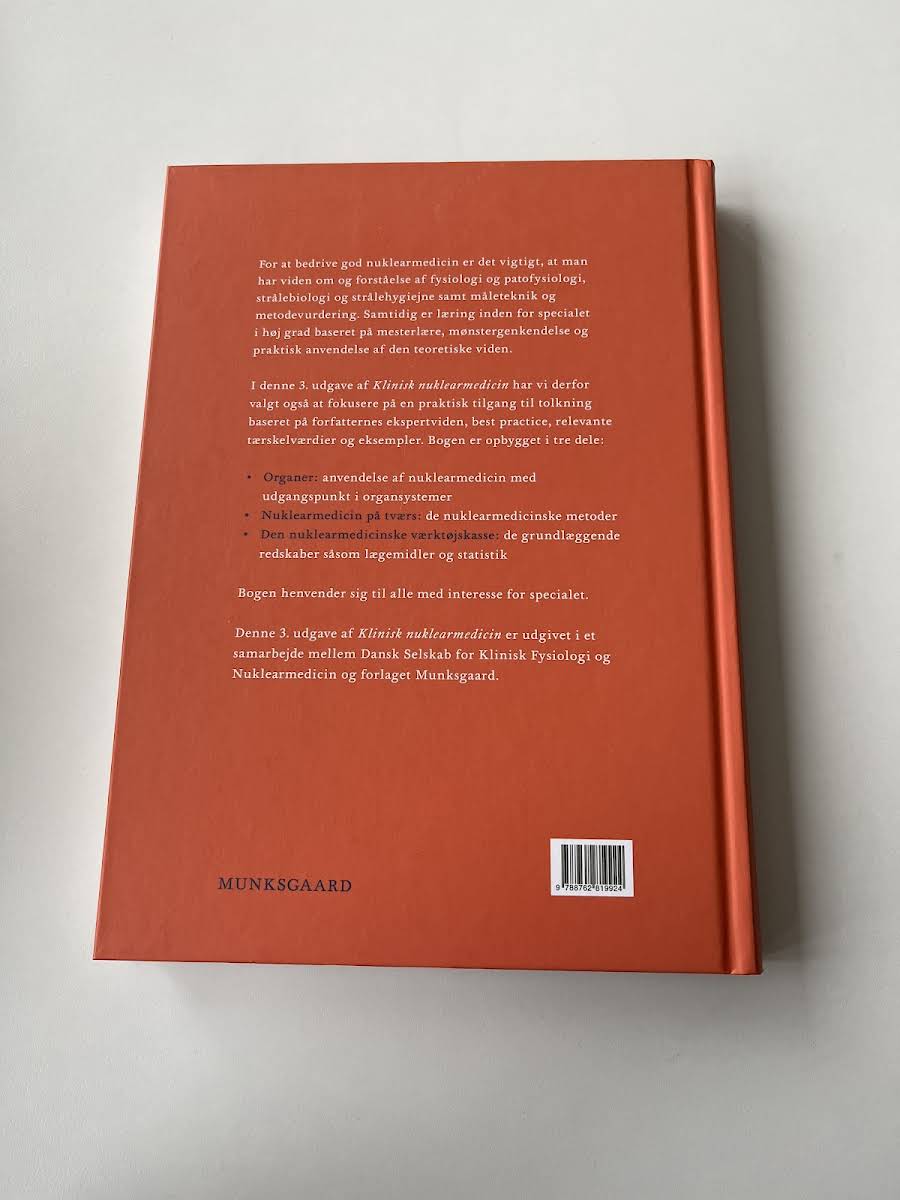 For at udøve kvalificeret nuklearmedicin er det afgørende at have indgående forståelse for fysiologi og patofysiologi, strålebiologi og strålehygiejne samt færdigheder inden for måleteknik og metodevurdering. Læring i specialet bygger desuden i høj grad på mesterlære, mønstergenkendelse og konkret anvendelse af teoretisk viden i kliniske situationer. I denne 3. udgave af Klinisk nuklearmedicin (2022) lægges der særlig vægt på en praktisk tilgang til billed- og datatolkning, understøttet af forfatternes ekspertviden, best practice, relevante tærskelværdier og illustrative eksempler. Bogen er inddelt i tre hoveddele: 1. Organer - nuklearmedicinske metoder på tværs af organsystemer 2. Nuklearmedicin på tværs - teknikker og modaliteter 3. Den nuklearmedicinske værktøjskasse - grundlæggende redskaber som lægemidler og statistik Klinisk nuklearmedicin retter sig mod alle med interesse for specialet og er udgivet i samarbejde mellem Dansk Selskab for Klinisk Fysiologi og Nuklearmedicin og forlaget Munksgaard.