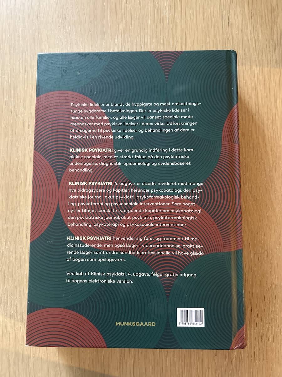 Psykiske lidelser hører til blandt de mest udbredte og omkostningstunge sygdomme i befolkningen. Næsten alle familier har erfaringer med psykiske problemer, og alle læger - uanset speciale - vil møde patienter med psykiske lidelser i deres daglige arbejde. Klinisk psykiatri giver en grundig indføring i dette komplekse speciale med et stærkt fokus på psykiatrisk undersøgelse, diagnostik, epidemiologi og evidensbaseret behandling. Bogen klæder læseren på til at vurdere symptomer, stille diagnoser og iværksætte relevante behandlingsstrategier. I denne 4. udgave (2016) er indholdet gennemrevideret og ajourført i lyset af ny forskning. Der er tilføjet særskilte kapitler om psykopatologi, den psykiatriske journal, akut psykiatri, psykofarmakologisk behandling, psykoterapi og psykosociale interventioner, så bogen i alt omfatter 656 sider med aktuel viden fra en bred kreds af specialister. Klinisk psykiatri henvender sig først og fremmest til medicinstuderende, men også til læger i videreuddannelse, praktiserende læger og andre sundhedsprofessionelle, som har brug for et solidt opslagsværk i det psykiatriske felt.