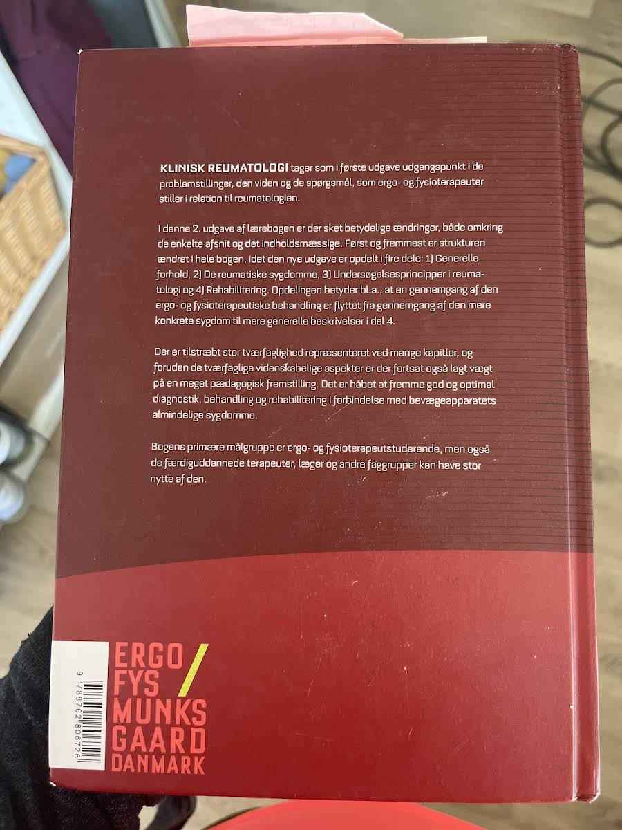 Klinisk reumatologi er en omfattende fagbog, der giver et grundlag for forståelsen af reumatologiens kliniske aspekter. Bogen fokuserer på de udfordringer, der opstår i forbindelse med led, blødt væv og bindevæv, og præsenterer et indgående overblik over både diagnosticering og rehabilitering af reumatiske sygdomme. Bogen er struktureret i fire dele, der hver især behandler centrale emner fra de generelle forhold til specifikke reumatiske lidelser, undersøgelsesprincipper og den efterfølgende rehabilitering. Med bidrag fra førende eksperter inden for området tilbyder dette værk en solid teoretisk og praktisk tilgang, der er særlig relevant for ergo- og fysioterapistuderende samt andre sundhedsprofessionelle. Første udgave fra 2011, udgivet af Gyldendal, illustrerer et helhedssyn på reumatologi, og dens omfattende indhold på 496 sider gør den til en uvurderlig ressource for alle, der arbejder med eller studerer reumatologi.