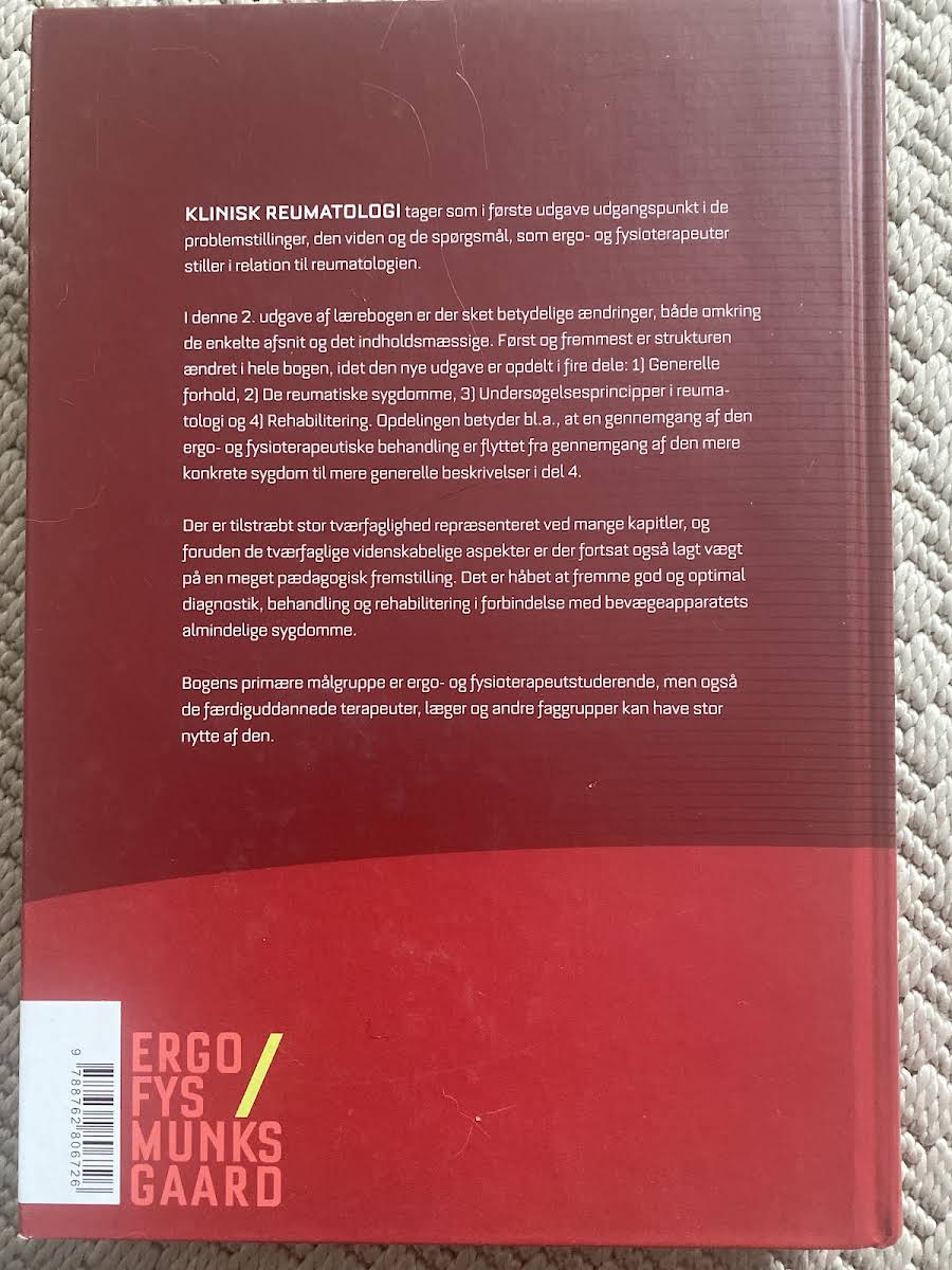 Klinisk reumatologi er en omfattende fagbog, der giver et grundlag for forståelsen af reumatologiens kliniske aspekter. Bogen fokuserer på de udfordringer, der opstår i forbindelse med led, blødt væv og bindevæv, og præsenterer et indgående overblik over både diagnosticering og rehabilitering af reumatiske sygdomme. Bogen er struktureret i fire dele, der hver især behandler centrale emner fra de generelle forhold til specifikke reumatiske lidelser, undersøgelsesprincipper og den efterfølgende rehabilitering. Med bidrag fra førende eksperter inden for området tilbyder dette værk en solid teoretisk og praktisk tilgang, der er særlig relevant for ergo- og fysioterapistuderende samt andre sundhedsprofessionelle. Første udgave fra 2011, udgivet af Gyldendal, illustrerer et helhedssyn på reumatologi, og dens omfattende indhold på 496 sider gør den til en uvurderlig ressource for alle, der arbejder med eller studerer reumatologi.
