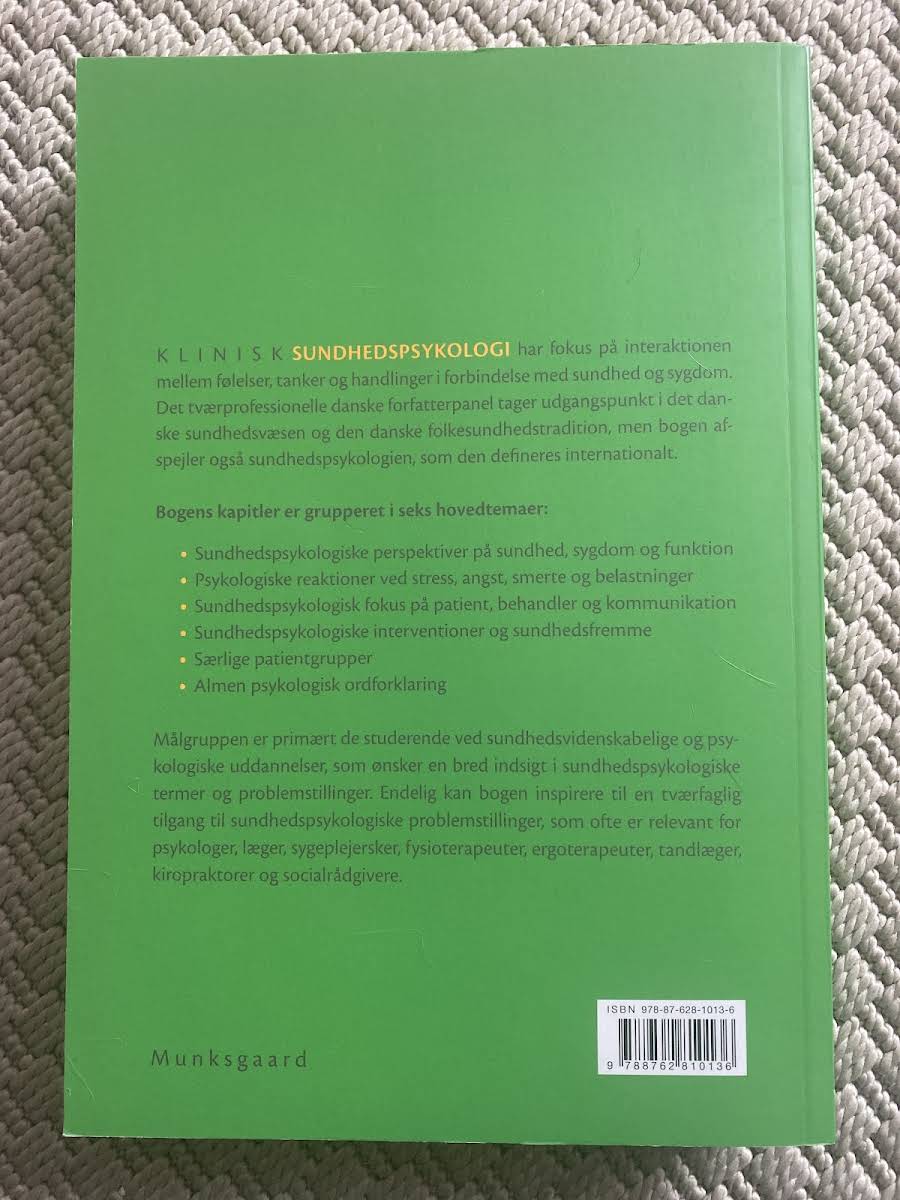 Klinisk sundhedspsykologi er en grundig tekstbog, der henvender sig til studerende inden for sundhedsvidenskab og psykologi, som ønsker en bred forståelse af sundhedspsykologisk terminologi og de centrale problemstillinger på området. Bogen er udarbejdet af et tværprofessionelt forfatterpanel med udgangspunkt i det danske sundhedsvæsen og den folkesundhedstradition, men rummer også en internationalt orienteret tilgang til sundhedspsykologi. Indholdet er struktureret i seks hovedtemaer: sundhedspsykologiske perspektiver på sundhed, sygdom og funktion, psykologiske reaktioner ved stress, angst, smerte og belastninger, sundhedspsykologisk fokus på patient, behandler og kommunikation samt sundhedspsykologiske interventioner og sundhedsfremme. Derudover omfatter bogen temaer omkring særlige patientgrupper og en almen psykologisk ordforklaring, hvilket giver en helhedsorienteret og tværfaglig tilgang til emnet.