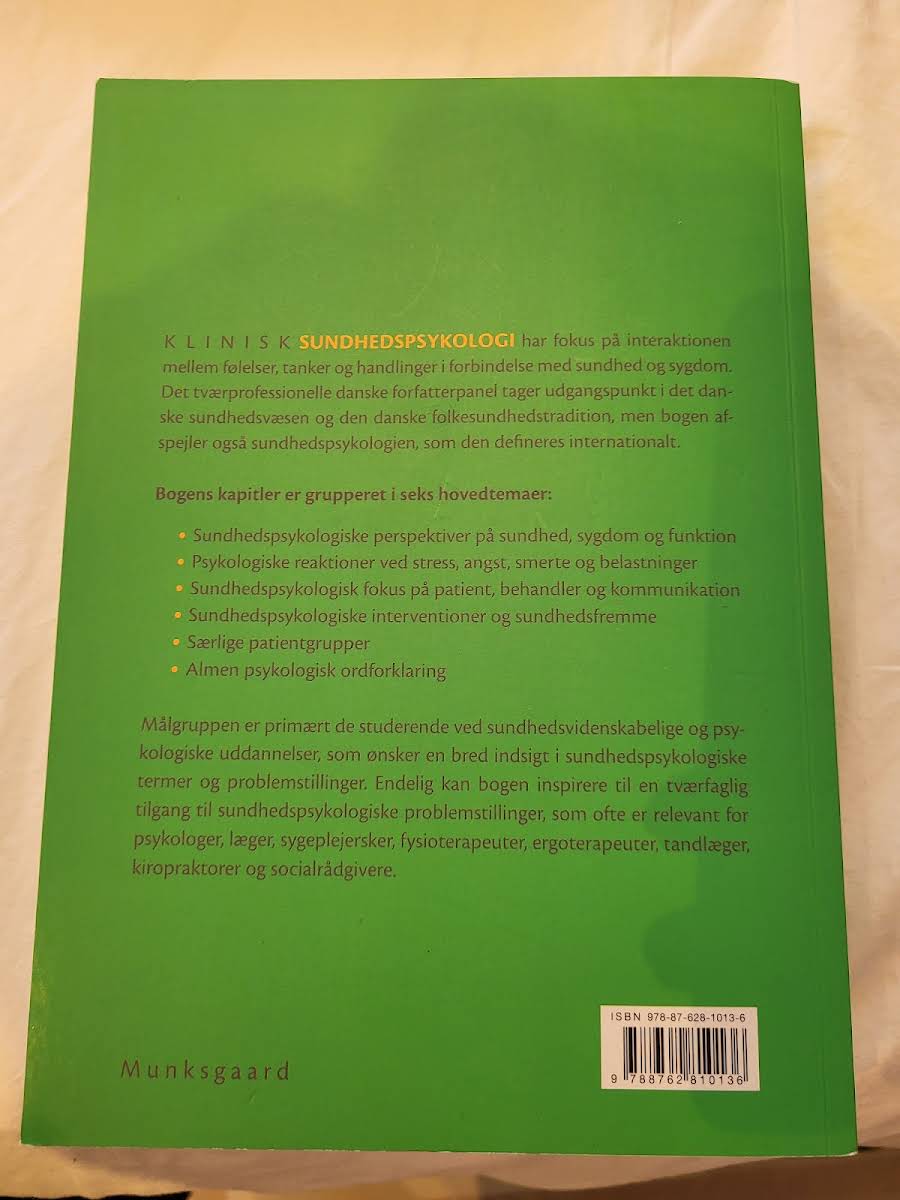 Klinisk sundhedspsykologi er en grundig tekstbog, der henvender sig til studerende inden for sundhedsvidenskab og psykologi, som ønsker en bred forståelse af sundhedspsykologisk terminologi og de centrale problemstillinger på området. Bogen er udarbejdet af et tværprofessionelt forfatterpanel med udgangspunkt i det danske sundhedsvæsen og den folkesundhedstradition, men rummer også en internationalt orienteret tilgang til sundhedspsykologi. Indholdet er struktureret i seks hovedtemaer: sundhedspsykologiske perspektiver på sundhed, sygdom og funktion, psykologiske reaktioner ved stress, angst, smerte og belastninger, sundhedspsykologisk fokus på patient, behandler og kommunikation samt sundhedspsykologiske interventioner og sundhedsfremme. Derudover omfatter bogen temaer omkring særlige patientgrupper og en almen psykologisk ordforklaring, hvilket giver en helhedsorienteret og tværfaglig tilgang til emnet.