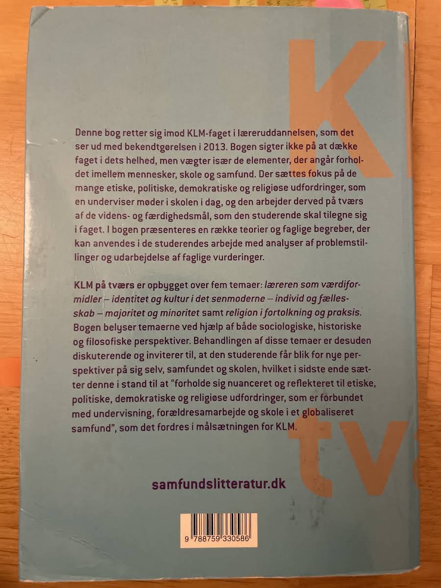 "KLM på tværs" af Bjørg Bogisch henvender sig til studerende på læreruddannelsen, som skal undervise i KLM-faget. Bogen baserer sig på bekendtgørelsen fra 2013 og sætter fokus på samspillet mellem mennesker, skole og samfund. Den udforsker de etiske, politiske, demokratiske og religiøse udfordringer, der i dag er en integreret del af undervisningspraksis. Med udgangspunkt i en bred tværfaglig tilgang introducerer bogen en række teorier og begreber, der kan anvendes i analysen af komplekse faglige problemstillinger. "KLM på tværs" er struktureret omkring fem overordnede temaer, herunder lærerens rolle som værdiformidler, identitet og kultur, forholdet mellem individ og fællesskab, majoritet og minoritet samt religion i fortolkning og praksis. Gennem sociologiske, historiske og filosofiske perspektiver inviterer bogen de studerende til at reflektere over nye tilgangsvinkler til sig selv, skolen og samfundet. Bogen giver dermed et solidt grundlag for at forholde sig nuanceret og reflekteret til de mange udfordringer, der præger undervisning og dannelse i en moderne og globaliseret verden.