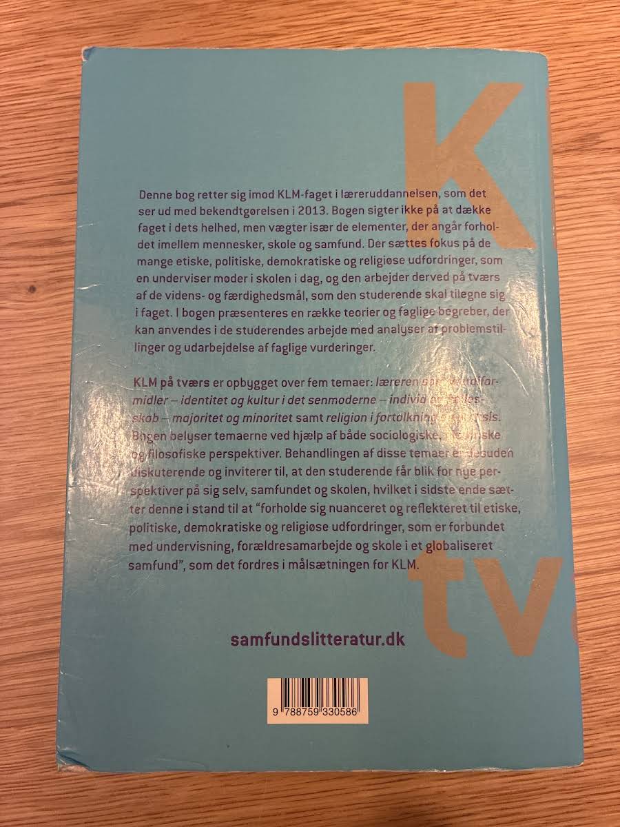 "KLM på tværs" af Bjørg Bogisch henvender sig til studerende på læreruddannelsen, som skal undervise i KLM-faget. Bogen baserer sig på bekendtgørelsen fra 2013 og sætter fokus på samspillet mellem mennesker, skole og samfund. Den udforsker de etiske, politiske, demokratiske og religiøse udfordringer, der i dag er en integreret del af undervisningspraksis. Med udgangspunkt i en bred tværfaglig tilgang introducerer bogen en række teorier og begreber, der kan anvendes i analysen af komplekse faglige problemstillinger. "KLM på tværs" er struktureret omkring fem overordnede temaer, herunder lærerens rolle som værdiformidler, identitet og kultur, forholdet mellem individ og fællesskab, majoritet og minoritet samt religion i fortolkning og praksis. Gennem sociologiske, historiske og filosofiske perspektiver inviterer bogen de studerende til at reflektere over nye tilgangsvinkler til sig selv, skolen og samfundet. Bogen giver dermed et solidt grundlag for at forholde sig nuanceret og reflekteret til de mange udfordringer, der præger undervisning og dannelse i en moderne og globaliseret verden.