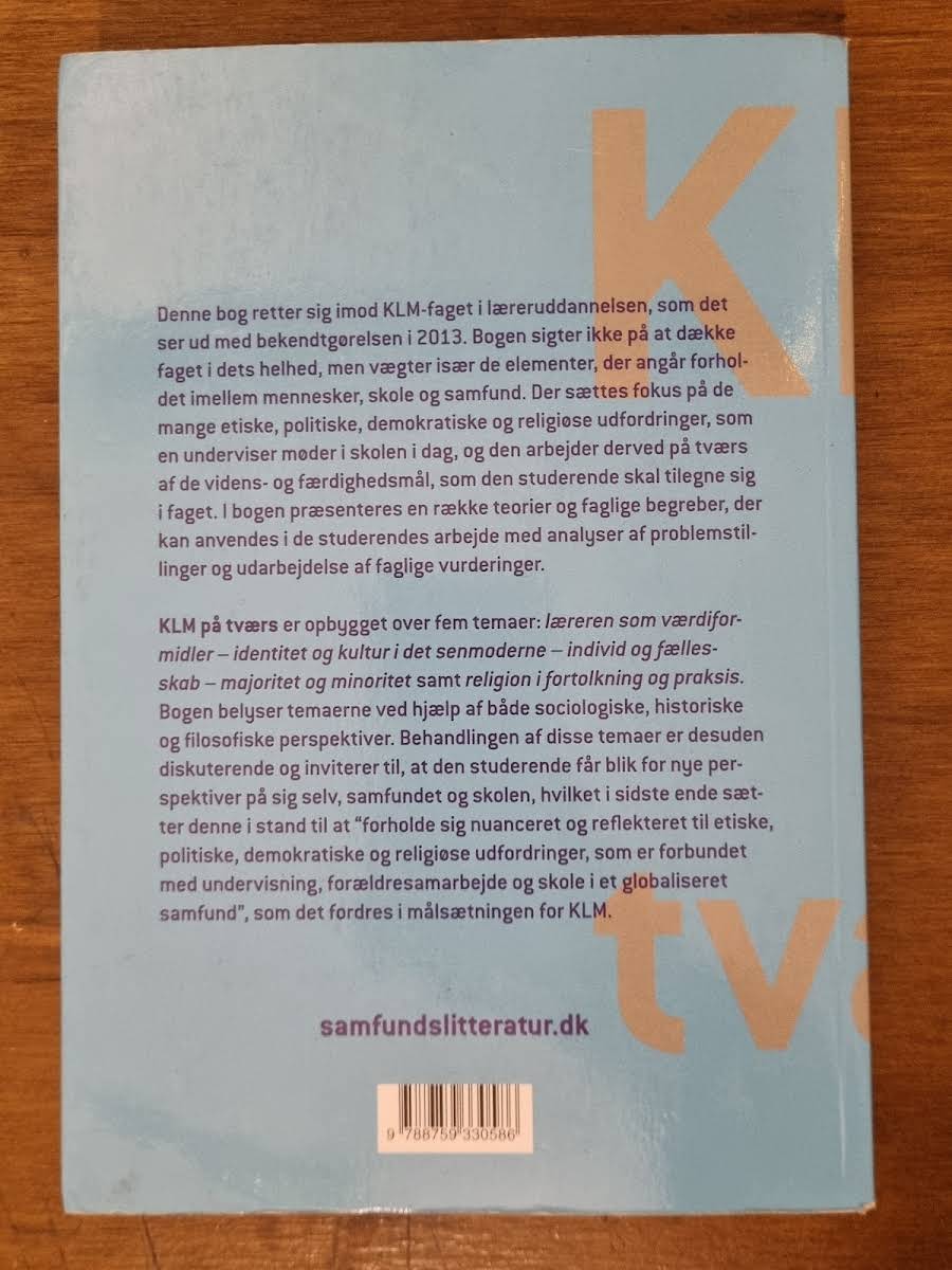 "KLM på tværs" af Bjørg Bogisch henvender sig til studerende på læreruddannelsen, som skal undervise i KLM-faget. Bogen baserer sig på bekendtgørelsen fra 2013 og sætter fokus på samspillet mellem mennesker, skole og samfund. Den udforsker de etiske, politiske, demokratiske og religiøse udfordringer, der i dag er en integreret del af undervisningspraksis. Med udgangspunkt i en bred tværfaglig tilgang introducerer bogen en række teorier og begreber, der kan anvendes i analysen af komplekse faglige problemstillinger. "KLM på tværs" er struktureret omkring fem overordnede temaer, herunder lærerens rolle som værdiformidler, identitet og kultur, forholdet mellem individ og fællesskab, majoritet og minoritet samt religion i fortolkning og praksis. Gennem sociologiske, historiske og filosofiske perspektiver inviterer bogen de studerende til at reflektere over nye tilgangsvinkler til sig selv, skolen og samfundet. Bogen giver dermed et solidt grundlag for at forholde sig nuanceret og reflekteret til de mange udfordringer, der præger undervisning og dannelse i en moderne og globaliseret verden.