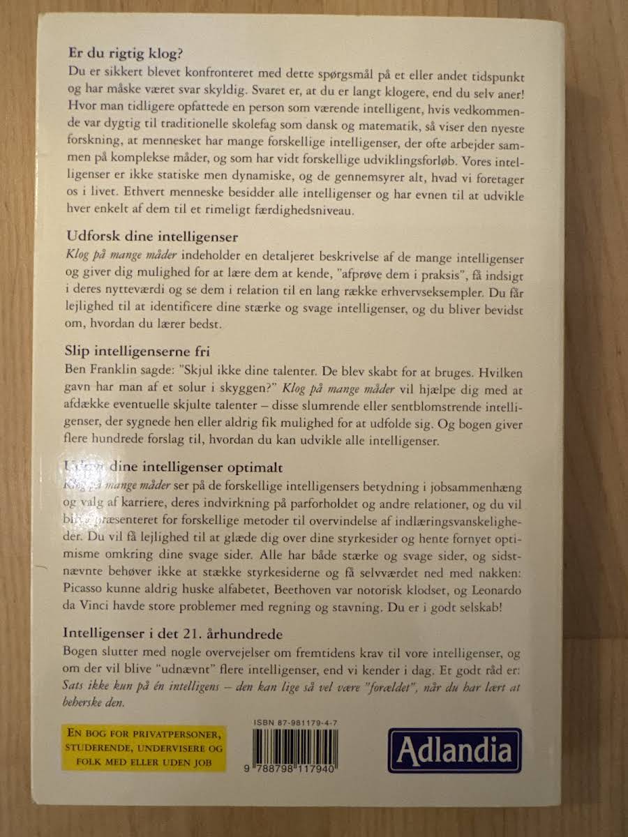 Thomas Armstrong’s "Klog på mange måder – Sådan udvikler du dine mange intelligenser" præsenterer en nuanceret tilgang til, hvordan vi alle kan opdage og styrke vores forskellige intelligenser. Bogen belyser de mange (indtil nu 9) intelligenser gennem eksempler fra kendte personligheder, forskellige erhverv, kulturer og relationer. Gennem velovervejede tjeklister får læseren mulighed for at kortlægge egne styrker og svagheder. Med rigt indhold, der indeholder cirka 200 konkrete forslag og øvelser, er bogen et redskab til både personlig udvikling og forståelse af, hvordan intelligenser kan påvirke vores rolle i samfundet. Dette inspirerende værk giver både private, studerende og undervisere et solidt grundlag for at arbejde med og udvikle deres mange intelligenser – og understreger, at det aldrig er for sent at blive klogere på sig selv.