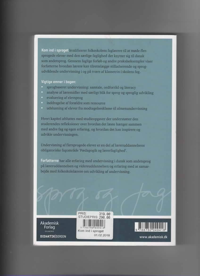 Med "Kom ind i sproget" får folkeskolens lærere et solidt redskab til at møde flersprogede elever med den nødvendige pædagogiske og sprogdidaktiske faglighed. Bogen lægger vægt på, hvordan undervisningen kan tilpasses for at styrke elevernes danske sprogudvikling og samtidig skabe en inkluderende læringskultur, hvor dialog og refleksion går hånd i hånd. Gennem en række praksiseksempler og faglige forløb præsenteres centrale emner som sprogbaseret undervisning med fokus på samtale, ordforråd og literacy, samt evaluering af elevsprog og analyse af læremidler med henblik på sproglig udvikling. Hvert kapitel afsluttes med studieopgaver, der inspirerer til tværfaglige forbindelser og understøtter den enkelte lærers egne erfaringer. Forfatterne Stine Kragholm Knudsen og Lone Wulff trækker på deres mangeårige erfaring med undervisning i dansk som andetsprog i både læreruddannelsen og videreuddannelsen, hvilket giver bogen en praktisk og reflekteret tilgang til et fagligt relevant emne.