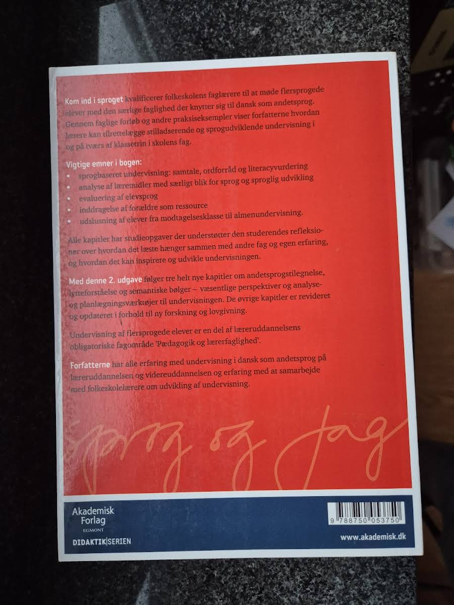 "Kom ind i sproget" giver folkeskolens lærere et solidt fagligt grundlag til at håndtere mødet med flersprogede elever. Bogen lægger vægt på, hvordan lærere kan designe stilladserende og sprogudviklende undervisning på tværs af klassetrin, med udgangspunkt i samtale, ordforråd, literacyvurdering og analyse af læremidler. Den understreger også vigtigheden af at evaluere elevsprog og inddrage forældre som en ressource i undervisningen. I denne 2. udgave er der tilføjet tre nye kapitler, der belyser andetsprogstilegnelse, lytteforståelse og semantiske bølger. Disse kapitler præsenterer vigtige perspektiver samt analyse- og planlægningsværktøjer, der understøtter den enkelte lærers arbejde. Hvert kapitel indeholder studieopgaver, der opfordrer til refleksion over, hvordan teori og praksis kan inspirere og videreudvikle undervisningen i dansk som andetsprog.