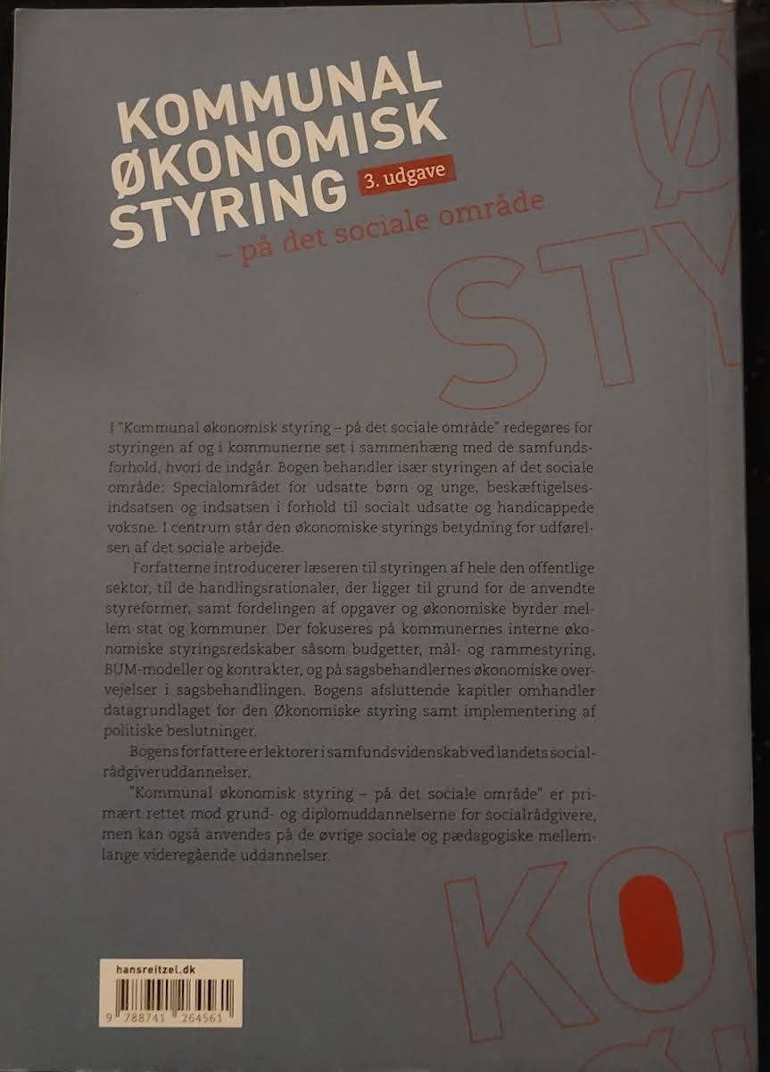 Bogen "Kommunal økonomisk styring – på det sociale område" giver en grundig gennemgang af den økonomiske styring i kommunerne med særligt henblik på det sociale område. Den 3. udgave er ajourført, idet den blandt andet omfatter et omfattende revideret kapitel 3, som reflekterer de nye refusionsregler og de medfølgende styringsudfordringer. Bogen introducerer til styringen af hele den offentlige sektor og redegør for de bagvedliggende styringsrationaler samt fordelingen af opgaver og økonomiske byrder mellem stat og kommune. Endvidere får man indsigt i kommunernes interne styringsredskaber som budgetter, mål- og rammestyring, BUM-modeller og kontrakter samt datagrundlaget bag implementeringen af de politiske beslutninger. Denne bog henvender sig primært til studerende på grund- og diplomuddannelserne for socialrådgivere og kan med fordel anvendes på andre sociale og pædagogiske videregående uddannelser.