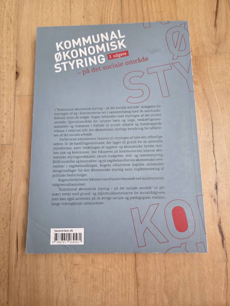 Bogen "Kommunal økonomisk styring – på det sociale område" giver en grundig gennemgang af den økonomiske styring i kommunerne med særligt henblik på det sociale område. Den 3. udgave er ajourført, idet den blandt andet omfatter et omfattende revideret kapitel 3, som reflekterer de nye refusionsregler og de medfølgende styringsudfordringer. Bogen introducerer til styringen af hele den offentlige sektor og redegør for de bagvedliggende styringsrationaler samt fordelingen af opgaver og økonomiske byrder mellem stat og kommune. Endvidere får man indsigt i kommunernes interne styringsredskaber som budgetter, mål- og rammestyring, BUM-modeller og kontrakter samt datagrundlaget bag implementeringen af de politiske beslutninger. Denne bog henvender sig primært til studerende på grund- og diplomuddannelserne for socialrådgivere og kan med fordel anvendes på andre sociale og pædagogiske videregående uddannelser.