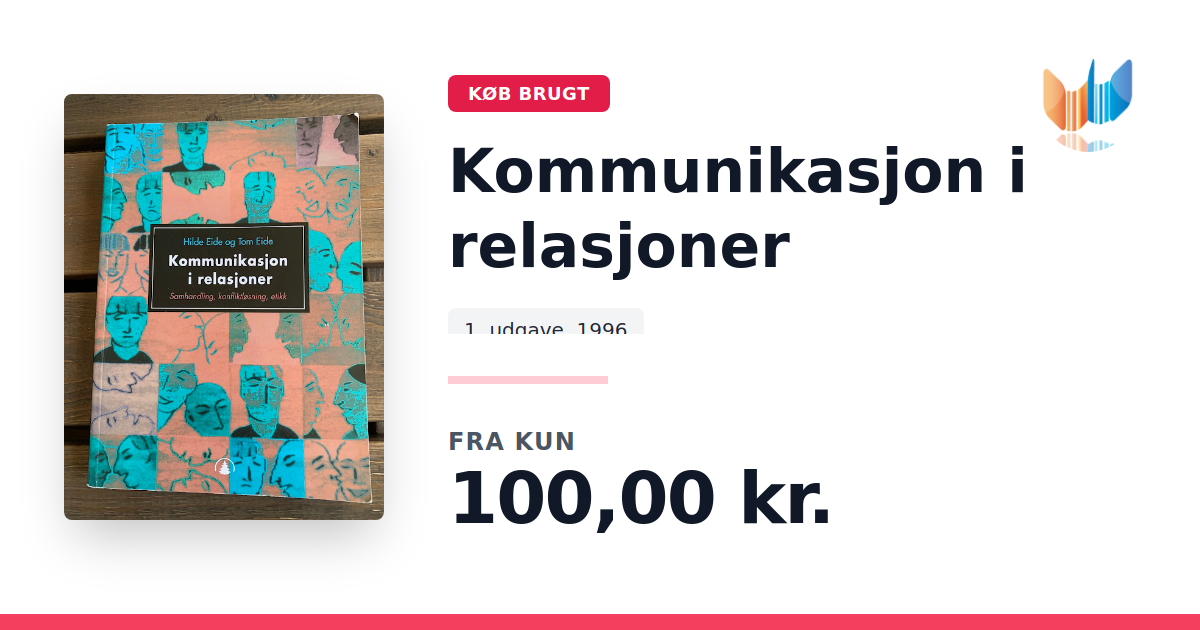 Lige nu kan du købe "Kommunikasjon i relasjoner" til kun 100,00 kr. Bogen du ser her er brugt, og i god stand. Vi har i øjeblikket kun et enkelt eksemplar til salg af "Kommunikasjon i relasjoner", så slå til mens du kan!