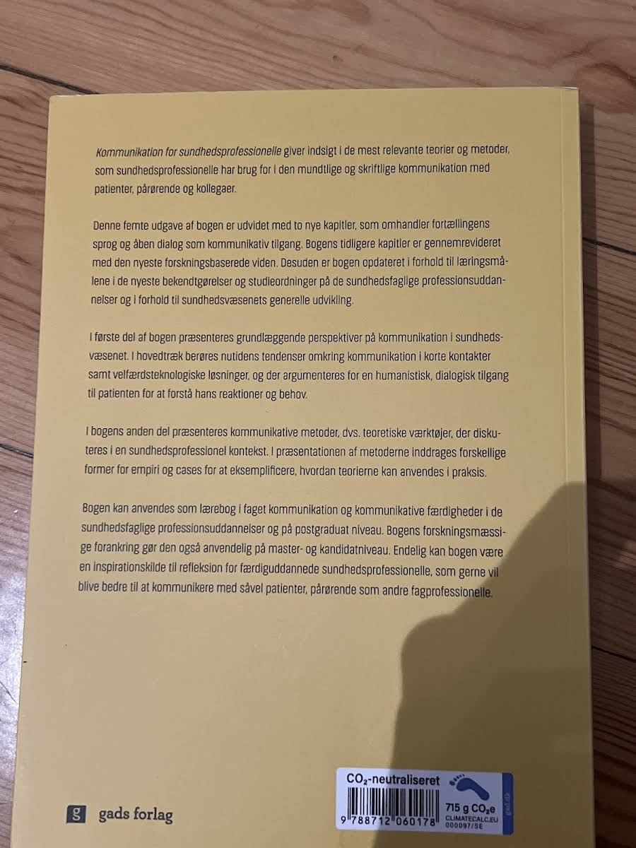 "Kommunikation for sundhedsprofessionelle" tilbyder en grundig indføring i de centrale teorier og metoder, som er uundværlige i den mundtlige og skriftlige dialog med patienter, pårørende og kollegaer. Bogen præsenterer og diskuterer kommunikation ud fra et sundhedsfagligt perspektiv, hvor fokus blandt andet ligger på, hvordan en humanistisk og dialogisk tilgang kan bidrage til en dybere forståelse af patientens behov og reaktioner. I første del skitseres de overordnede kommunikationsperspektiver og moderne tendenser, såsom kortvarige kontakter og integration af velfærdsteknologiske løsninger, der præger nutidens sundhedssektor. Anden del introducerer en række kommunikative metoder med teoretiske værktøjer, som illustreres ved hjælp af empiri og praksisnære cases, der gør det muligt at omsætte teori til handling. Udgivet i 2021 og med sine 318 sider, kan bogen anvendes både som lærebog i de sundhedsfaglige professionsuddannelser og som en inspirationskilde for færdiguddannede sundhedsprofessionelle, der ønsker at styrke deres kommunikationskompetencer.
