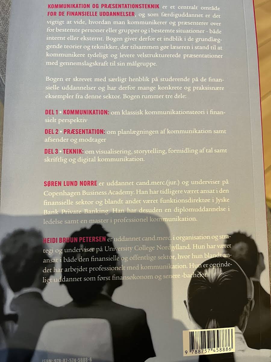 "Kommunikation og præsentationsteknik" er en grundlæggende lærebog for studerende på de finansielle uddannelser, hvor evnen til at kommunikere klart og præsentere med gennemslagskraft er altafgørende. Med et solidt fundament i de oplagte teorier og praktiske teknikker, hjælper bogen læseren med at opnå en skarp forståelse af, hvordan man tilpasser budskabet til både interne og eksterne målgrupper. Bogen er struktureret i tre overordnede dele. Den første del sætter fokus på klassisk kommunikationsteori med et finansielt perspektiv, mens den anden del dykker ned i planlægning og afsender-modtagerforholdet i præsentationer. Den tredje del introducerer teknikker inden for visualisering, storytelling, talformidling samt skriftlig og digital kommunikation. Forfatterne bag værket, Søren Lund Norre og Heidi Bruun Petersen, bringer en kombination af praktisk erfaring og akademisk indsigt til bordet. Søren, med en cand.merc.(jur.) og en baggrund fra den finansielle sektor, har blandt andet arbejdet som funktionsdirektør i Jyske Bank Private Banking. Heidi, der har en cand.merc. i organisation og strategi, har opbygget en bred erfaring inden for både den finansielle og offentlige sektor, med en karriere der startede som finansøkonom. Udgivet af Djøf Forlag i 2024 og udgivet i paperback, er denne første udgave et centralt redskab for dem, der ønsker at mestre kunsten at kommunikere og præsentere i en kompleks og foranderlig finansiel verden.