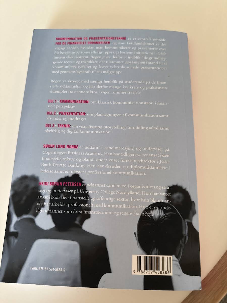 "Kommunikation og præsentationsteknik" er en grundlæggende lærebog for studerende på de finansielle uddannelser, hvor evnen til at kommunikere klart og præsentere med gennemslagskraft er altafgørende. Med et solidt fundament i de oplagte teorier og praktiske teknikker, hjælper bogen læseren med at opnå en skarp forståelse af, hvordan man tilpasser budskabet til både interne og eksterne målgrupper. Bogen er struktureret i tre overordnede dele. Den første del sætter fokus på klassisk kommunikationsteori med et finansielt perspektiv, mens den anden del dykker ned i planlægning og afsender-modtagerforholdet i præsentationer. Den tredje del introducerer teknikker inden for visualisering, storytelling, talformidling samt skriftlig og digital kommunikation. Forfatterne bag værket, Søren Lund Norre og Heidi Bruun Petersen, bringer en kombination af praktisk erfaring og akademisk indsigt til bordet. Søren, med en cand.merc.(jur.) og en baggrund fra den finansielle sektor, har blandt andet arbejdet som funktionsdirektør i Jyske Bank Private Banking. Heidi, der har en cand.merc. i organisation og strategi, har opbygget en bred erfaring inden for både den finansielle og offentlige sektor, med en karriere der startede som finansøkonom. Udgivet af Djøf Forlag i 2024 og udgivet i paperback, er denne første udgave et centralt redskab for dem, der ønsker at mestre kunsten at kommunikere og præsentere i en kompleks og foranderlig finansiel verden.