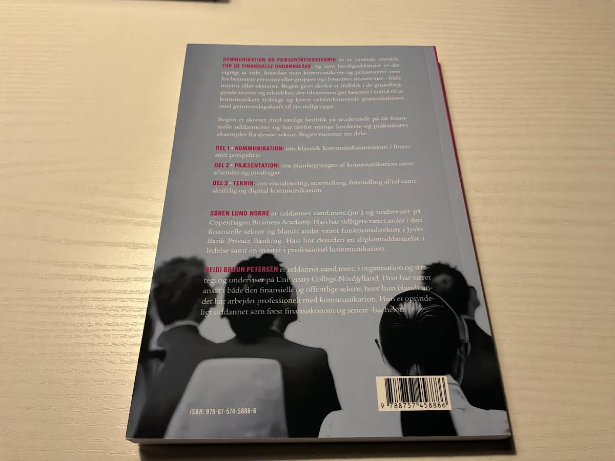 "Kommunikation og præsentationsteknik" er en grundlæggende lærebog for studerende på de finansielle uddannelser, hvor evnen til at kommunikere klart og præsentere med gennemslagskraft er altafgørende. Med et solidt fundament i de oplagte teorier og praktiske teknikker, hjælper bogen læseren med at opnå en skarp forståelse af, hvordan man tilpasser budskabet til både interne og eksterne målgrupper. Bogen er struktureret i tre overordnede dele. Den første del sætter fokus på klassisk kommunikationsteori med et finansielt perspektiv, mens den anden del dykker ned i planlægning og afsender-modtagerforholdet i præsentationer. Den tredje del introducerer teknikker inden for visualisering, storytelling, talformidling samt skriftlig og digital kommunikation. Forfatterne bag værket, Søren Lund Norre og Heidi Bruun Petersen, bringer en kombination af praktisk erfaring og akademisk indsigt til bordet. Søren, med en cand.merc.(jur.) og en baggrund fra den finansielle sektor, har blandt andet arbejdet som funktionsdirektør i Jyske Bank Private Banking. Heidi, der har en cand.merc. i organisation og strategi, har opbygget en bred erfaring inden for både den finansielle og offentlige sektor, med en karriere der startede som finansøkonom. Udgivet af Djøf Forlag i 2024 og udgivet i paperback, er denne første udgave et centralt redskab for dem, der ønsker at mestre kunsten at kommunikere og præsentere i en kompleks og foranderlig finansiel verden.