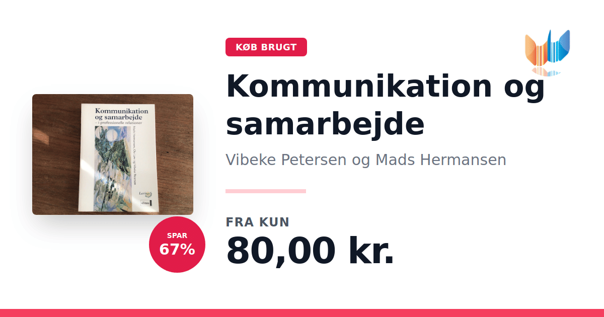 Lige nu kan du købe "Kommunikation og samarbejde" af Vibeke Petersen og Mads Hermansen til kun 80,00 kr. Du sparer hele 67% af nyprisen! Bogen du ser her er brugt, og i perfekt stand. Vi har i øjeblikket 13 eksemplarer til salg af "Kommunikation og samarbejde", så husk at se de forskellige udgaver.