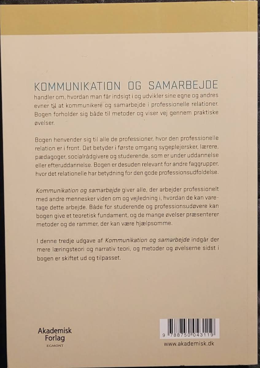 "Kommunikation og samarbejde" er en essentiel lærebog, der skaber indsigt i, hvordan man udvikler sine evner til både at kommunikere og samarbejde i professionelle relationer. Bogen er udformet af Vibeke Petersen, Mads Hermansen og Ole Løw og kombinerer et solidt teoretisk fundament med praktiske øvelser, som understøtter den daglige professionelle udøvelse i et bredt spektrum af fag. Med sin klare struktur og lettilgængelige tilgang præsenterer bogen relevante metoder og øvelser, der styrker dialogen mellem kolleger og med brugere af de professionelle ydelser. "Kommunikation og samarbejde" henvender sig til alle, der arbejder med mennesker – herunder pædagoger, lærere, sygeplejersker, læger, tandlæger og socialrådgivere – og tilbyder en række redskaber, der binder teori og praksis sammen på en inspirerende og moderne måde.
