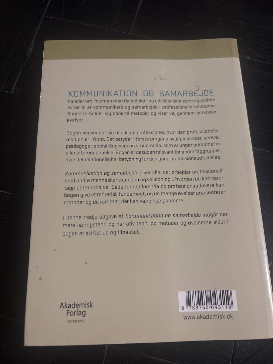 "Kommunikation og samarbejde" er en essentiel lærebog, der skaber indsigt i, hvordan man udvikler sine evner til både at kommunikere og samarbejde i professionelle relationer. Bogen er udformet af Vibeke Petersen, Mads Hermansen og Ole Løw og kombinerer et solidt teoretisk fundament med praktiske øvelser, som understøtter den daglige professionelle udøvelse i et bredt spektrum af fag. Med sin klare struktur og lettilgængelige tilgang præsenterer bogen relevante metoder og øvelser, der styrker dialogen mellem kolleger og med brugere af de professionelle ydelser. "Kommunikation og samarbejde" henvender sig til alle, der arbejder med mennesker – herunder pædagoger, lærere, sygeplejersker, læger, tandlæger og socialrådgivere – og tilbyder en række redskaber, der binder teori og praksis sammen på en inspirerende og moderne måde.