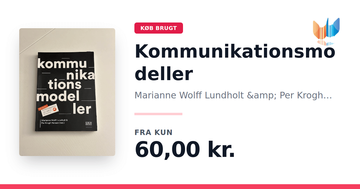 Lige nu kan du købe "Kommunikationsmodeller" af Marianne Wolff Lundholt & Per Krogh Hansen til kun 60,00 kr. Bogen du ser her er brugt, og i god stand. Vi har i øjeblikket kun et enkelt eksemplar til salg af "Kommunikationsmodeller", så slå til mens du kan!