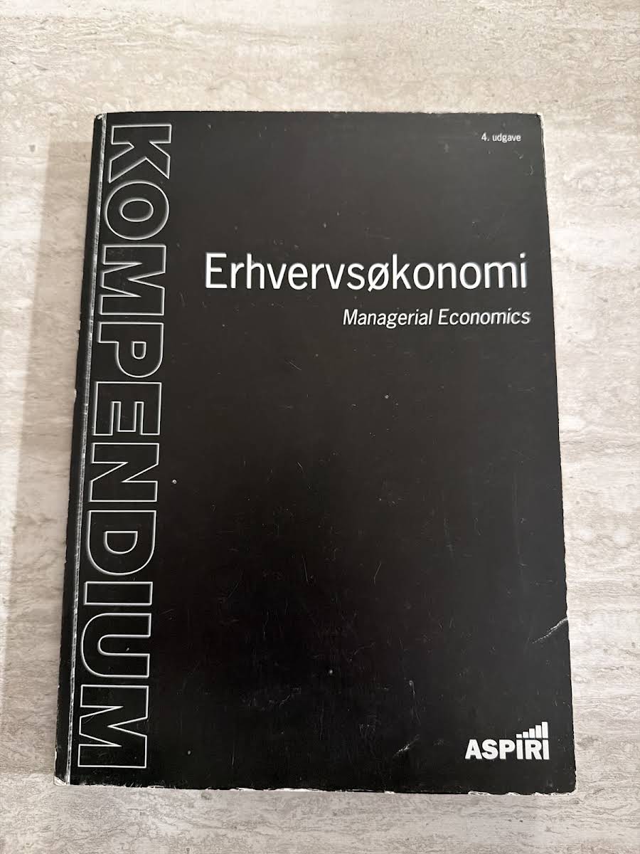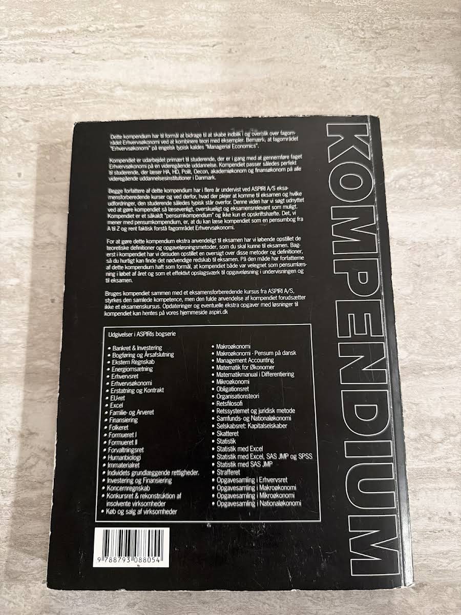 "Kompendium i Erhvervsøkonomi" er designet med henblik på at give studerende en dybdegående forståelse af erhvervsøkonomi gennem en harmonisk blanding af teori og praktiske eksempler. Bogen er målrettet studerende, der er i gang med at gennemføre faget på videregående uddannelser som HA, HD, Polit, Oecon, akademiøkonom og finansøkonom i Danmark. For at styrke den studerendes eksamensforberedelse indeholder kompendiet løbende teoretiske definitioner og metoder til opgaveløsning, der er essentielle ved eksamen. Med sin klare opbygning gør "Kompendium i Erhvervsøkonomi" det nemt at navigere i stoffet og finde relevante værktøjer, hvilket understøtter en effektiv repetition af centrale begreber og metoder.