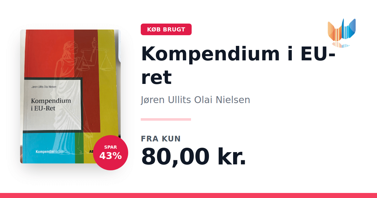 Lige nu kan du købe "Kompendium i EU-ret" af Jøren Ullits Olai Nielsen til kun 80,00 kr. Du sparer hele 43% af nyprisen! Bogen du ser her er brugt, og i god stand. Vi har i øjeblikket 2 eksemplarer til salg af "Kompendium i EU-ret", så husk at se de forskellige udgaver.