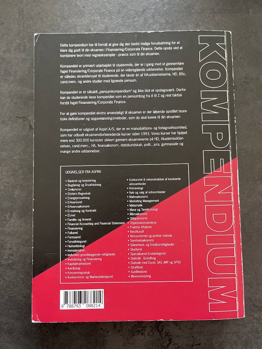 Dette kompendium i Finansiering (Corporate Finance) er skabt med henblik på at give de studerende solide forudsætninger for at mestre faget. Ved at kombinere teori med praktiske regneeksempler opnår du en dybdegående forståelse, som er essentiel til din eksamen og videre studier inden for finansiering. Kompendiet er udarbejdet specielt til studerende på videregående uddannelser, og det henvender sig til dem, der læser uddannelser som HA, HD, BSc, cand.merc. eller lignende. Med sit fokus på de centrale elementer af faget fungerer bogen som et fuldstændigt pensumkompendium, der dækker hele spektrummet fra grundlæggende teorier til praktiske opgaveløsningsmetoder.