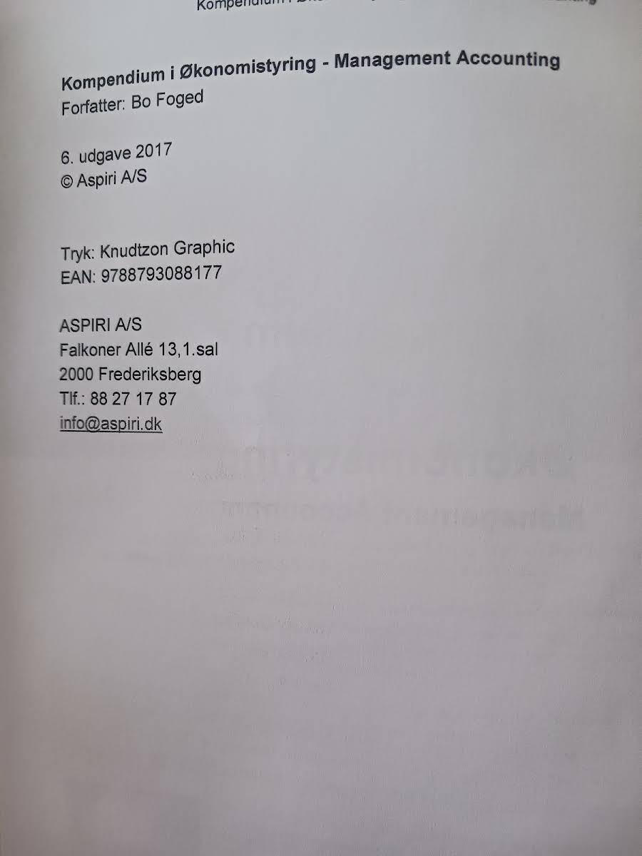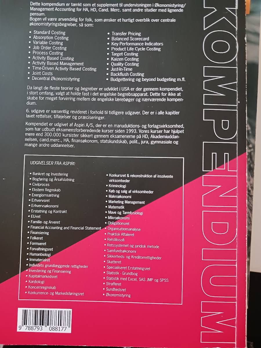 Kompendium i økonomistyring fra Aspiri, 2018, er designet som et uundværligt supplement til undervisningen i økonomistyring for HA, HD, Cand. Merc. og andre studieprogrammer med tilsvarende pensum. Med klarhed og præcision præsenterer kompendiet centrale koncepter og analyser, der danner grundlag for forståelsen af moderne økonomistyring. Bogen giver et hurtigt overblik over essentielle emner, herunder Standard Costing, Absorption Costing, Variable Costing, Job Order Costing og Process Costing. Derudover dækker den avancerede metoder som Time-Driven Activity Based Costing, Joint Costs, Activity Based Costing samt Activity Based Management. Kompendiet berører også emner som Decentral Økonomistyring, Transfer Pricing, Balanced Scorecard, Key Performance Indicators, Product Life Cycle Costing, Target Costing, Kaizen Costing, Quality Costing, Just-In-Time, Backflush Costing samt Budgettering og Beyond Budgeting. Da de fleste teorier og begreber stammer fra USA, følger bogen det engelske begrebsapparat for at sikre sammenhæng og undgå forvirring. Kompendiet er dermed et praktisk og opdateret redskab for studerende, der ønsker et solidt overblik over de væsentligste aspekter af økonomistyring.