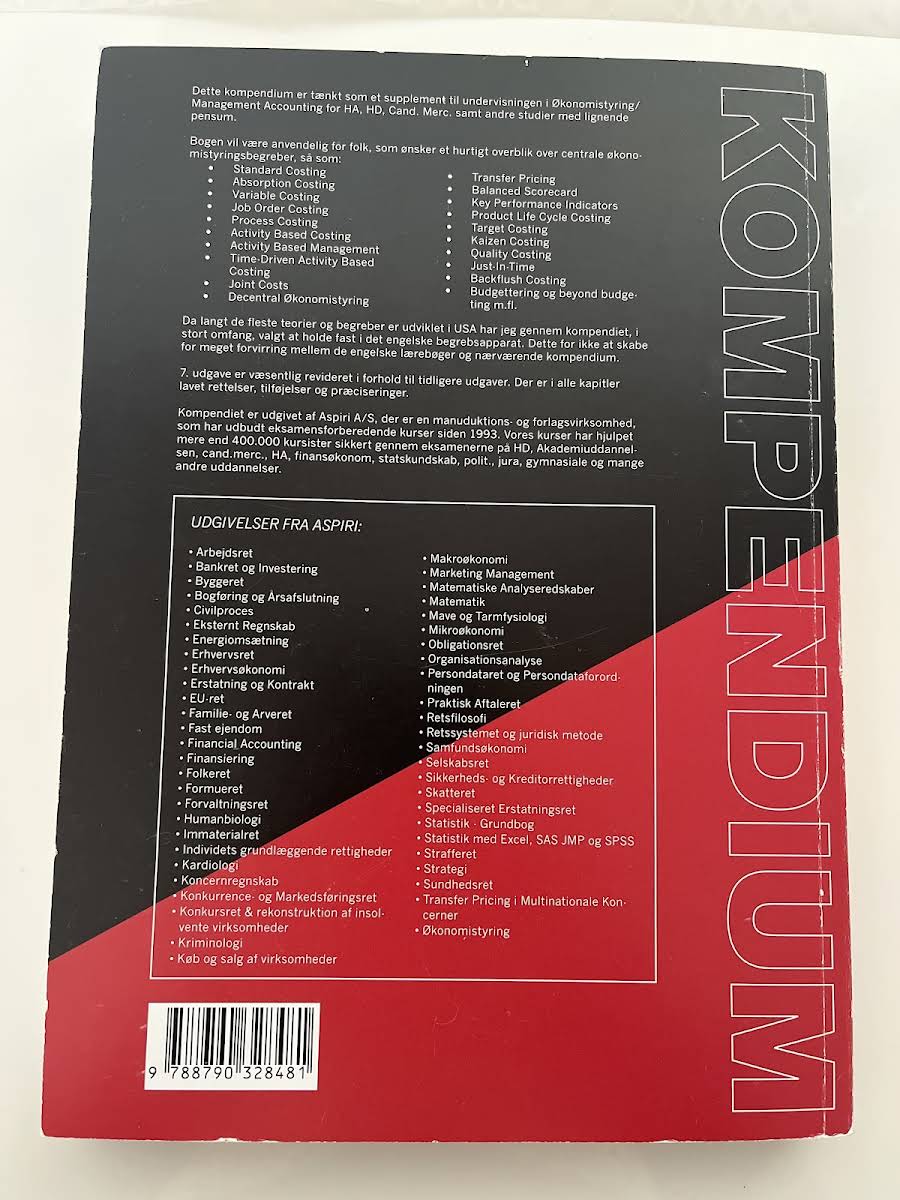 Dette kompendium er tænkt som et supplement til undervisningen i Økonomistyring/Management Accounting for HA, HD, Cand.merc. samt andre studier med tilsvarende pensum. Det giver et struktureret overblik over de vigtigste principper og metoder inden for økonomistyring og er ideel til den studerende, der ønsker et hurtigt og præcist referencemateriale. Du får et sammendrag af centrale økonomistyringsbegreber, bl.a.: • Standard Costing • Absorption Costing • Variable Costing • Job Order Costing og Process Costing • Time-Driven Activity Based Costing • Activity Based Management og Joint Costs • Decentral økonomistyring og Transfer Pricing • Balanced Scorecard og Key Performance Indicators • Product Life Cycle Costing og Target Costing • Kaizen Costing, Quality Costing og Just-In-Time • Backflush Costing, Budgettering og Beyond Budgeting m.fl. Da mange af teorierne er udviklet i USA, er der konsekvent brugt det engelske begrebsapparat gennem hele kompendiet for at undgå misforståelser i forhold til internationale lærebøger og fagartikler. 7. udgave af kompendiet er gennemgribende revideret i forhold til tidligere udgaver, og alle kapitler indeholder væsentlige rettelser, tilføjelser og præciseringer, så indholdet er aktuelt og i overensstemmelse med den nyeste faglige udvikling.