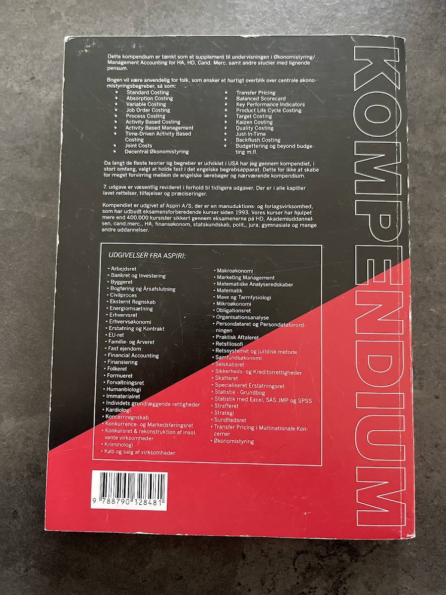 Dette kompendium er tænkt som et supplement til undervisningen i Økonomistyring/Management Accounting for HA, HD, Cand.merc. samt andre studier med tilsvarende pensum. Det giver et struktureret overblik over de vigtigste principper og metoder inden for økonomistyring og er ideel til den studerende, der ønsker et hurtigt og præcist referencemateriale. Du får et sammendrag af centrale økonomistyringsbegreber, bl.a.: • Standard Costing • Absorption Costing • Variable Costing • Job Order Costing og Process Costing • Time-Driven Activity Based Costing • Activity Based Management og Joint Costs • Decentral økonomistyring og Transfer Pricing • Balanced Scorecard og Key Performance Indicators • Product Life Cycle Costing og Target Costing • Kaizen Costing, Quality Costing og Just-In-Time • Backflush Costing, Budgettering og Beyond Budgeting m.fl. Da mange af teorierne er udviklet i USA, er der konsekvent brugt det engelske begrebsapparat gennem hele kompendiet for at undgå misforståelser i forhold til internationale lærebøger og fagartikler. 7. udgave af kompendiet er gennemgribende revideret i forhold til tidligere udgaver, og alle kapitler indeholder væsentlige rettelser, tilføjelser og præciseringer, så indholdet er aktuelt og i overensstemmelse med den nyeste faglige udvikling.