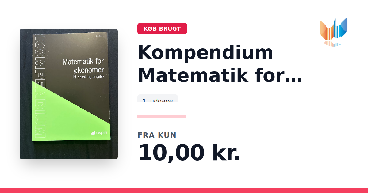 Lige nu kan du købe "Kompendium Matematik for økonomer " til kun 10,00 kr. Bogen du ser her er brugt, og i perfekt stand. Vi har i øjeblikket 2 eksemplarer til salg af "Kompendium Matematik for økonomer ", så husk at se de forskellige udgaver.