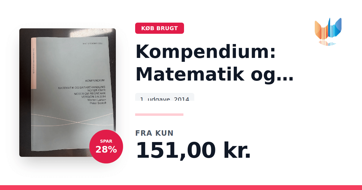 Lige nu kan du købe "Kompendium: Matematik og Databehandling R/regneark" til kun 151,00 kr. Du sparer hele 28% af nyprisen! Bogen du ser her er brugt, og i perfekt stand. Vi har i øjeblikket kun et enkelt eksemplar til salg af "Kompendium: Matematik og Databehandling R/regneark", så slå til mens du kan!