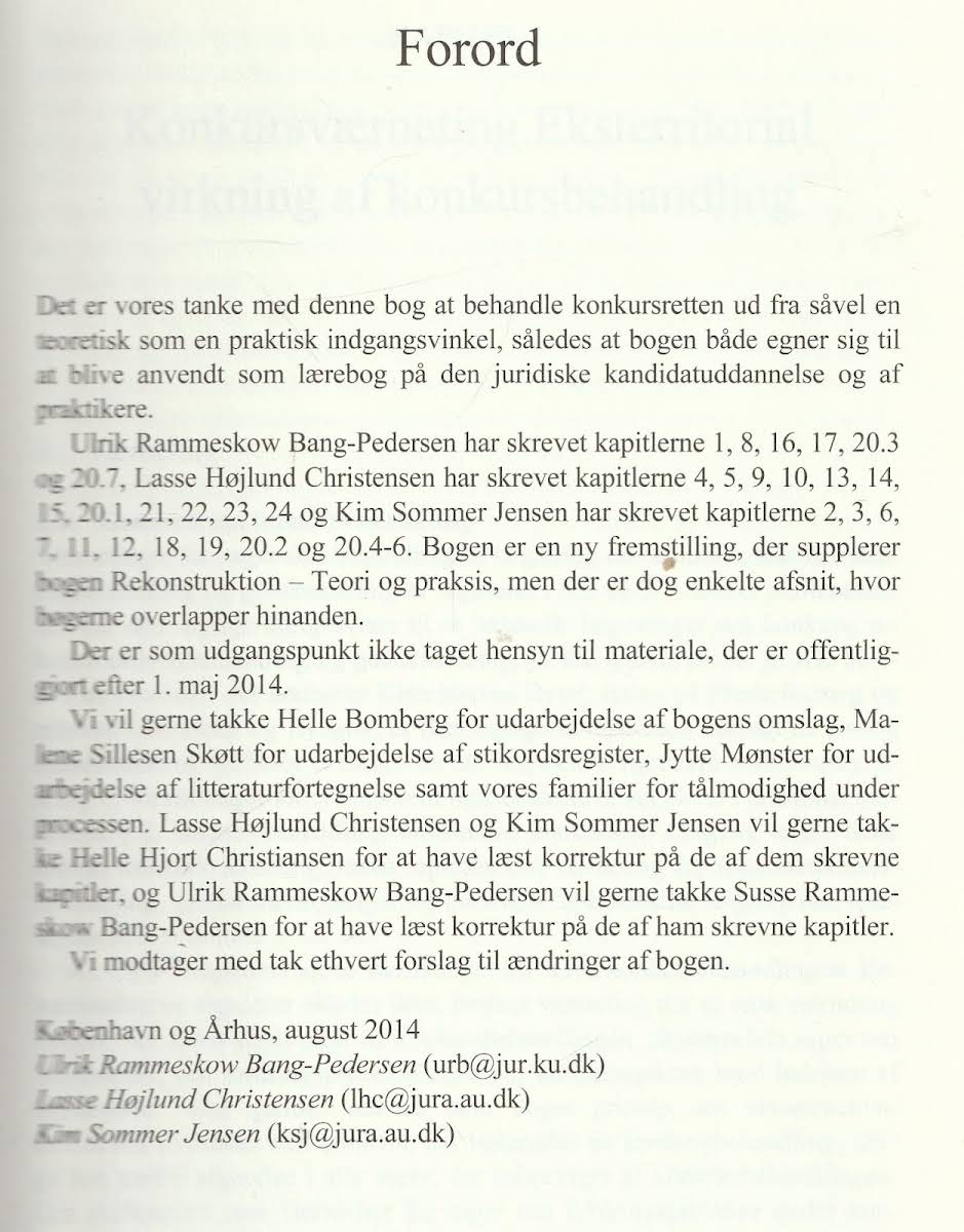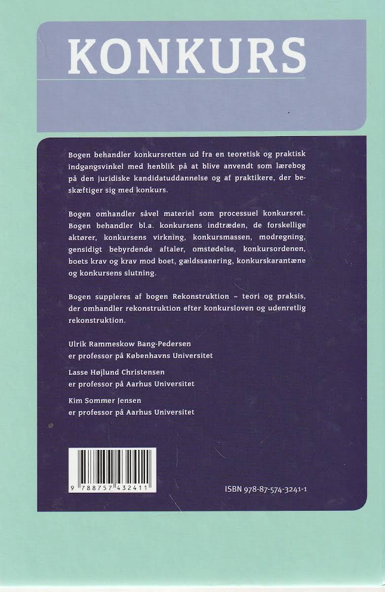 Konkurs giver en dybdegående behandling af konkursretten med fokus på både de teoretiske og praktiske aspekter. Bogen gennemgår centrale elementer som, hvordan konkurs indtræder og ophører, de forskellige aktørers roller, og hvordan konkursboet struktureres. Desuden indgår diskussioner om modregning, omstødelse, gældssanering og konkurskarantæne samt behandlingen af boets krav og krav mod boet. Med et indhold, der omfatter både materiel og processuel konkursret, er Konkurs et uvurderligt redskab for juridiske studerende, samtidig med at den tjener som en praktisk guide for aktører i feltet. Bogen er velegnet til alle, der ønsker et solidt indblik i de komplekse problemstillinger, som kendetegner konkursrettens univers.