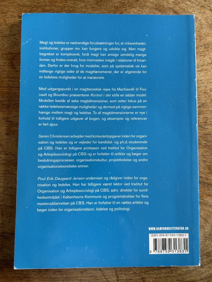 Kontrol i det stille – om magt og ledelse er et centralt værk af Søren Christensen og Poul Erik Daugaard Jensen, som nøje undersøger magtbegrebets mange facetter og dets betydning for ledelse. Gennem seks velstrukturerede kapitler præsenteres en model, der belyser forskellige magtdimensioner. Bogen behandler temaer som direkte magt, indirekte magt, bevidsthedskontrollerende magt, magt i en "Garbage Can-situation," institutionel magt og relationel magt. Med en systematisk tilgang formår forfatterne at skabe en sammenhængende forståelse af, hvordan de forskellige former for magt interagerer med ledelsesprocesser. Kontrol i det stille tilbyder læseren analytiske redskaber og teoretiske perspektiver, der kan være uvurderlige for både undervisning og praktisk ledelsesudøvelse. Bogen giver derfor et solidt grundlag for dem, der ønsker at dykke ned i sammenhængen mellem magt og ledelse.