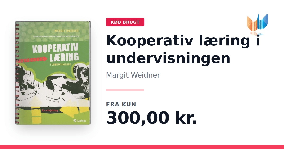 Lige nu kan du købe "Kooperativ læring i undervisningen" af Margit Weidner til kun 300,00 kr. Bogen du ser her er brugt, og i perfekt stand. Vi har i øjeblikket kun et enkelt eksemplar til salg af "Kooperativ læring i undervisningen", så slå til mens du kan!