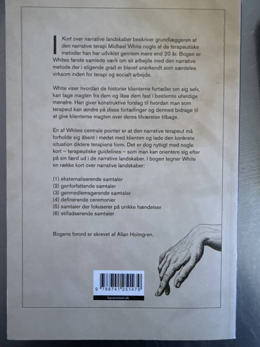 Kort over narrative landskaber er et centralt værk af Michael White, manden bag den narrative terapimetode. I bogen præsenteres et udvalg af terapeutiske teknikker, som understreger vigtigheden af at møde klienten med åbenhed og lade den konkrete situation bestemme terapiformen. Med udgangspunkt i mange års erfaring demonstrerer White, hvordan den måde, vi fortæller vores egne historier på, kan fastlåse os i mønstre, der hæmmer forandring. Gennem en række illustrative eksempler opfordrer han terapeuten til at arbejde kreativt med samtalen – fra eksternaliserende dialoger til genforfattende samtaler – med henblik på at åbne op for nye fortællinger og muligheder. Bogen udgør således en inspirerende og dybtgående guide til narrativ terapi, der både er praktisk funderet og etisk forankret. Kort over narrative landskaber byder på et unikt overblik over de metoder, der har hjulpet utallige mennesker til at ændre deres livshistorie.