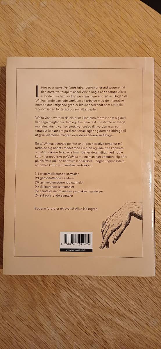 Kort over narrative landskaber er et centralt værk af Michael White, manden bag den narrative terapimetode. I bogen præsenteres et udvalg af terapeutiske teknikker, som understreger vigtigheden af at møde klienten med åbenhed og lade den konkrete situation bestemme terapiformen. Med udgangspunkt i mange års erfaring demonstrerer White, hvordan den måde, vi fortæller vores egne historier på, kan fastlåse os i mønstre, der hæmmer forandring. Gennem en række illustrative eksempler opfordrer han terapeuten til at arbejde kreativt med samtalen – fra eksternaliserende dialoger til genforfattende samtaler – med henblik på at åbne op for nye fortællinger og muligheder. Bogen udgør således en inspirerende og dybtgående guide til narrativ terapi, der både er praktisk funderet og etisk forankret. Kort over narrative landskaber byder på et unikt overblik over de metoder, der har hjulpet utallige mennesker til at ændre deres livshistorie.