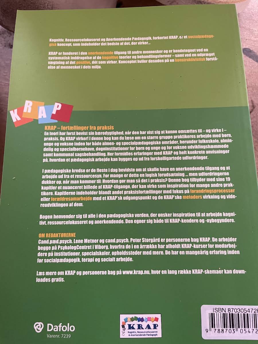 Kognitiv, Ressourcefokuseret og Anerkendende Pædagogik, forkortet KRAP, er et socialpædagogisk koncept, som indeholder det bedste af det, der virker... Den pædagogiske tilgang tager udgangspunkt i den anerkendende tilgang til andre mennesker, ved en systematisk inddragelse af de kognitive teorier og behandlingsformer samt ved en udpræget vægtning af det positive, det som virker. Konceptet hviler desuden på en konstruktivistisk forståelse af mennesket i dets miljø. Bogen er skrevet for praktiker