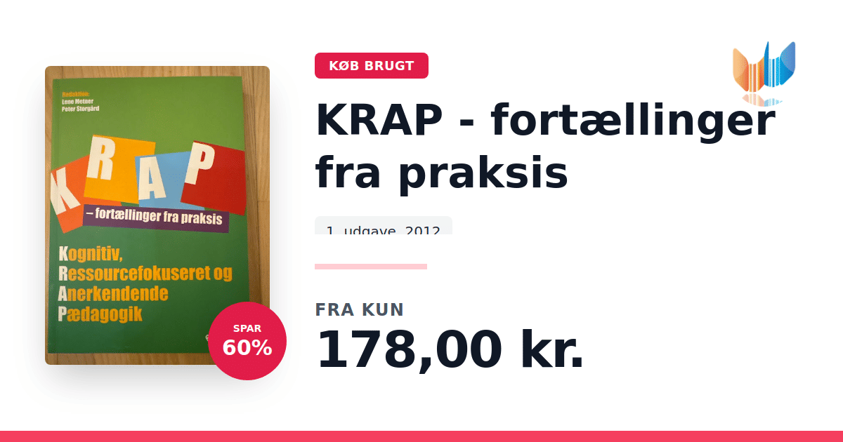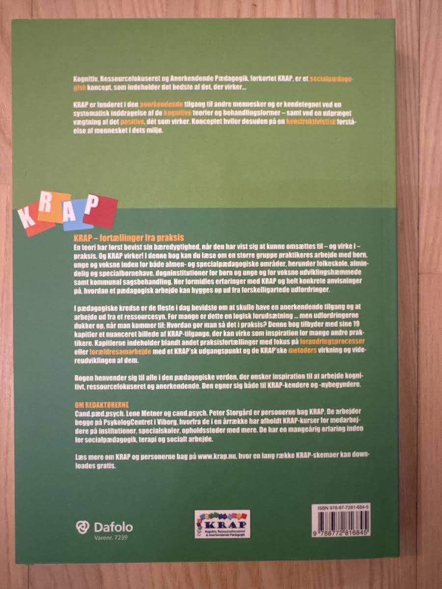 KRAP - fortællinger fra praksis giver et samlet indblik i den kognitive, ressourcefokuserede og anerkendende pædagogik. Konceptet bygger på en anerkendende tilgang til mennesket og vægter det positive ved systematisk at inddrage kognitive teorier og behandlingsformer. Fundamentet er en konstruktivistisk forståelse af individet i dets miljø, hvor formålet er at styrke ressourcer og muligheder. Bogen præsenterer 19 kapitler fyldt med praksisfortællinger fra en bred vifte af pædagogiske sammenhænge - både almindelige og specialiserede. Du møder eksempler fra folkeskole, børnehaver, døgninstitutioner for børn og unge samt tilbud til voksne med udviklingshæmning, ligesom kommunal sagsbehandling indgår. Hvert kapitel giver konkrete anvisninger til, hvordan man kan strukturere arbejdet ud fra forskellige udfordringer. Læseren stifter bekendtskab med KRAP’s metoders virkning og udvikling, forandringsprocesser og forældresamarbejde set gennem en KRAP’sk linse. Desuden udfoldes de teoretiske forståelsesrammer og arbejdsprocesser, så du får redskaber til at handle i mødet med menneskers ressourcer og vanskeligheder. Med sine 296 sider henvender bogen sig til alle, der ønsker at omsætte kognitive, ressourcefokuserede og anerkendende principper til praksis. Den er lige så velegnet for dig, der er ny i KRAP, som for dig, der vil hente ny inspiration og sparring i arbejdet med børn, unge og voksne.