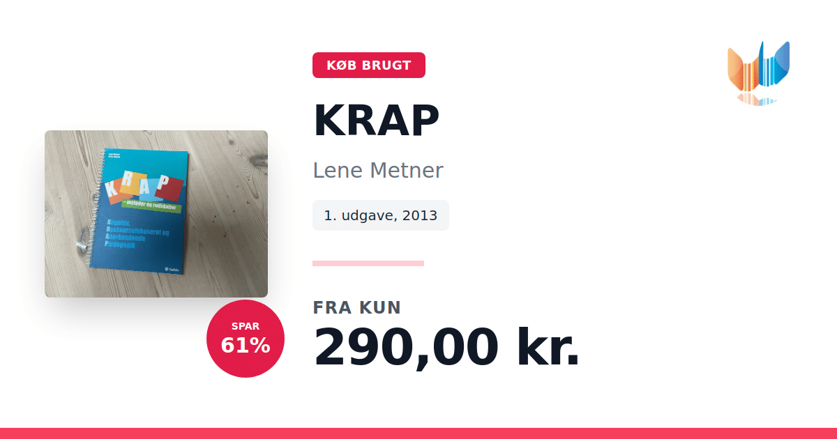 Lige nu kan du købe "KRAP" af Lene Metner til kun 290,00 kr. Du sparer hele 61% af nyprisen! Bogen du ser her er brugt, og i perfekt stand. Vi har i øjeblikket 3 eksemplarer til salg af "KRAP", så husk at se de forskellige udgaver.